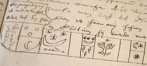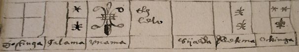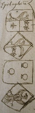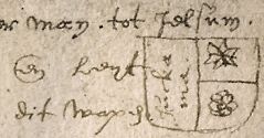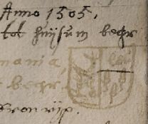 1501 • 4 Oct. Liet Graeff Huygo Leysennach, stadtholder van Frieslant, Douwe van Galama van Ackrum tot Sneeck aentasten ende in bewaeringhe stellen, omme dat hij over sijn tijt ende geleyde hier int lant bleeff. Hij worde terstont tot Franiker ghefoert, ende hoewel daer veel heerschippen waeren vergaedert, om hem te verbidden, liet graeff Huygo hem niettegenstaende dien den 8 Oct. des morgens voer ses uren op Syaardemahuys heymelijck onthooffden. 1503 • Schelto Lyauckema, Luttie oft Luts Haarsma man, tot Sneeck begraven • 31 Mar. Bot Hubbema, ende leyt bij Taco Glins ende Haebel Haensma begraven tot Dronrijp ![]() 1505 • Tet Haarsma in der IJlst bij Sneeck sterff 13 April. anno 1505 • 5 Maii Hessel Jelgers Feytzma, His [ ] man, tot Huysum begr. • Op S. Gregorii avont [= 12 maart] Bocke Aggez. Burmania, Sytie Kamstra man, tot Minnaert begr. [met tekening wapen] • Op S. Mechielsdach [= 29 september] Tiete Hummama, tot Dronrijp • Primo [= 1] Aprilis obiit vir nobilis Syds Sythiema grietmannus de Ferwerderadeel, Womck Juckama man, tot Hallum begraven 1506 • Sept. Sterff Philippus de 1., coninck van Spangien, vaeder van Carolus de 5., tot Bourges in Spangien niet sonder suspitie van venijn 1509 • 15 Sept. Sywert Aelva in een hoechwaeter verdronken • 17 Januarii Sypt Jeppama op S. Anthonisavont. Hij voerde Goslinga-waepen ende leyt tot Marrum bij Feyo Jeppama begraven 1510• 4 Dec. Auck Auckema ende Kempo Donia haer man, tot Jelsum • Op S. Eufemii dach [= 20 januari] sterff Worp Juckma ende leyt tot Hallum begraven, voerende dit [hiernaast getekende] wapen • 4 Dec. op St. Jacopsdach [= 25 juli] worde Mr. Pieter Auckema tot Leewerden in de tweedracht van de burgers onnoselijcken op Uniastins tot Wirdum dootgeslaegen. His uxor eius Rynia. 1512 • Worden Jemme heer Juwsma ende Tzyaert Mockama als verraders des vaderlants van den Stadtholder van Vrieslant onthooft ende tot de Minnebroeders in die kercke laeten begraven • 5 Junii Rienck Popma, Rieme [ ] man, tot Menaem begraven • 4 Julii Sterff Focko Ropta, Graets Eysinga man • 24 Junii Graetz Eysinga, Focko Ropta wijff ende leggen beyde tot Metselwyer begraven. Haer vyer quartieren waren Ropta, Meckma, Eysinga, J[u]wsma, twelck was een enkel arent met een leu opt borst gelijck die van Sterkenburch nu ter tijt voeren • Sterff Bajazeh Tursche keyser, aeta. 74 1513 • 27 Junii Rienck van Andla ende Jets Groustins sijn wijff, tot Weydum • Kempo Donia ende Auck Auckema sijn wijff, tot Jelsum 1515 • 6 Julii Sydts Emega, Ansck Loonya man, in Galeyen begr. • 1 Martii Goffo Goffezoon Abygha ende leyt tot Steens in de kerck begraven 1516 • Worden Eepo Douma ende Abba Saskers Heeringa sijn swaeger van den Boergoenschen tot Harlingen onthooft • Worde Popcko Gabbama oft Hyeemstra (die goet Geldersch was) in een slach bij Gheenum van den Burgoenschen in sijn [ ] ghewont daer hij corts aen sterff 1517 • Op S. [ ] Sytie Kamstra, Bocko Aggaz. Burmania wijff, tot Hinnaert begraven • Epitaphium Alberti Crantz, inscriptum monumento in caemiterio summi templi Hamburgi, anno 1517 in vigilia conceptionis virginis matris gloriosae [= 8 december], spectabilis ac egregius vir Dominus Albertus Crantz, Sacrae Theologiae ac Decretorum eximius Doctor, ecclesiae Hamburgensis canonicus. lector facundissimus doctissimusque, & olim decanus: morum virtutum specimen & exemplar, patriae decus, feliciter concessit in fata, cuius anima cum beatis molliter quiescat. Amen. 1518 • Johannes Reuchlinus sive Capnio, Germanus, Pfortzensis, obiit in patria magnis auctus honoribus 1520 • 20[?] Sept. Lollo Ockinga, Aelke Harmana man, Dronrijp 1521 • 28 Dec. Auck Harinxma, Romcke Hoeytsma wijff, tot Sneeck begr. • 28 Maii J[u]w Aelva, tot Lewerden in Jacopijnen in de Noordertrans beg. 1522 • 14 Sept. De moeder [Ath van Sjaerdema] van Rienck Burmania D.V.I. Caes. Mat. Conciliarius, tot Oldehooff • 9 April. Rienck Campstra ende Gerlant Hoxwyer sijn wijff, Galeyster • 20 Sept. Hette Deeckma, Reynsck Campstra man, in Galeysterkerck • 23 Octob. Womck Juckama, Sydts Sitzma wijff, Hallum begraven 1524 • 4 Julii Jetz Groustins ende Rienck van Andla haer man, tot Weydum 1525 • 21 Junii Jantien Walta ende Pieter Donia haer man, tot Jelsum beg. 1527 • 4 Junii His [ ], Hessel Jelger Feytsma wijff, tot Huysum beg. • 10 Apr., dat was doen Paeschmaendach, sterff heer Sibren, Doecke Douwama zoon, pastoor tot Marssum • 8 Mar. Howelynck Sycko Lyauckama stalmeyster Cot. Mat. Olderman, Imck Minnama man, tot Sneeck beg. • 9 Nov. Heer Joh. Hiddama pastoor, tot Dronrijp 1528 • Op S. Thomisavont [= 21 december] sterff vrou Luttie oft Lutz Haarsma man • Schelto Lyauckama wijff, tot Sneeck begraven 1529 • 7 Oct. Feddo Doetinga ofte Dottnya, tot Marsum begraven • 4 Octob. Aemko Jarla grietman van Bergumerdeel ende leyt tot Hantumhuysum begraven • 22 Oct. Tziemck Eminga, Ruerd Feytsma wijff, tot Deynum begraven 1530 • 31 Decemb. Catharina Offenhuysen ende Douwe Aebinga haer man, Oldehooff • Naedat Jancke Douma van Oldeboorne den Hoeve suspeckt geworden was, is tot Meechelen ghevancklijck aenghetast ende tot Wilfoorden gheweest, daer hij a[nn]o 1530 sijnen natuerlijcken doot (soe men seyde) ghesturven is 1531 • 6 Oct. Wert Ulricus Swinglius verslaegen te Capelle in Switzerlant • 2 Apr. Peye Lyuwens ut Gronigerlant, die eerste huysvrou van D. Kempo Martna R. ende R. in den Hoeve van Vrieslant ende leyt in Galeysterkerck begraven 1532 • 6 Junii Gosse Gosseszoon Abiga ende Syrckyen Donya sijn wijff, ende leyt in Galeysterkerck in de Noordertrans begraven • 2 Octob. Tet [ ], Jancke Unama wijff, tot Blij begraven 1533 • 27 Jan. Low Donya heerschip binnen Sneeck • 25 Oct. Ansck Loonya, Sydts Emega wijff, in Galeyen begraven • 22 Dec. Jeppo Stanniga sive Stania 1534 • 3 Julii Wyck Aebbinga, Worp Ropta wijff, Metselwyer begr. 1535 • Syrck Donia, Syts Hemmama man, 28 Janua. tot Menaem begraven • Op S. Blasiusdach [= 3 febr