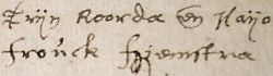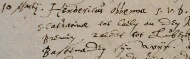 1601 • 13 Apr. Sibren Burmanya ende Frau Donya sijn wijff, tot Stiens • Douwe, Tzyaart Aelva ende Sibrich Goslinga zoon, Berck • 26 Junii Pieter Aggama, Eelck Emega man • 10 Aug. Maria van Tziaerda, eerst huysfrouwe van Juw Juwsma, daerna huysvrouwe van Feyo van Goslinga ende ten laesten huysvrouwe van Ritske van Eysinga, tot Wirdum begr. 1602 • 16 Janu. Hans Galema ende Rieme Popma sijn wijff • 8 Apr. Ebel Scheltama, die 1[e] huysvrow van Hendryck Hinckenna, dienaer des Goddelijcken woorts binnen Britsum • 23 Junii Epo Douma, Saeck Burmania man, tot Huysum • 28 Nov. Jemmo Burmania, Jel Aelva man, tot Ferwert den 5 Dec. begraven • 14 Dec. Auck Tziessens, Julius Meckamans wijff, tot Holwert den 21 • Doed Eeninga, Feyo Roorda wijff tot Gienum 1603 • 22 Martii Anna Lyauckama, Hessel Harmana wijff, tot Minnertscha • 14 Maii Dr. Baarda opper Idzart in die Wolden • 16 Maii H. Frans Eysingha • Maii Dr. Ayta • 12 Julii Ritske Unya • 31 Aug. Dr. Tzialling Eysingha grietman van Menaemerdeel • 1 Sept. His Feytzma, Hessel Meckmans wijff • 10 Sept. Johan Rengers, een zoonke van Joncker Dirck Rengers van der Arenshorst out omtrent 15 oft 16 jaer, tot Dockum • Sep. Maeyke Steernse, eerst Johan Martna ende naderhant Sybout Aelva huysvrow, tot Franiker den 12 Sept. • 21 Octob. Trijn Galama, hopman Hans Oostheyms wijff, tot Drylst • 18 Oct. Hopman Hans van Oostheym, Trijn Galama man, tot Drylst • 26 Nov. Doedt, Goslyck Heerama dr., van Boolswirt • des daechs voer [= 31 oktober] A[ller]H[eyligen] Doedt Oeninga, Feyo Roorda wijff, tot Dheenum 1604 • 15 April. Fed, Sybrandt Kamminga ende Trijn Donia dr., Olde[hooff] • Aug. Tiet Sterckenborch • 12 Septemb. Trijn Donia, Sybrant Kamminga huysvrow, Old[ehooff] • 20 Octob. Luts Hottinga • April. Pieter Deeckma hopman, tot Oestende doetgheschoeten, een zoene van Rienck Deeckma • Syrck Hemmama • Sybout Aysma 1605 • 24 Janu. Clarissimus vir D. Henricus Schotanus, p.m., I.U.D. & eiusdem in Academia Franequerana primus Professor • 3 Mart. Trijn Lyauckema ende Tzietse Peyma haer man, tot Franiker • 17 Mar. Bauck • 26 Mar. Wompt Mockama ende Roelant van Achlen haer man, Ferwert • 9 Maii Rintzen Oesinga ende Ulbe Aelva haer man, tot Ydaart • 11 Junii Att Ockma ende Gerrolt Kamminga haer man, Jacopijnen • 8 Julii Hessel Eminga ende Wick Harmana sijn wijff, aeta. 63 • 25 Julii Tzyalck, Dr. Baarda dochter, op ter Idzart in de Wolden • 26 Julii Sydts Emega ende Trijn Roorda sijn wijff, op de Schyngen beg. • Julii Auck • 23 Aug. Tietske Dijcxtra • 29 Aug. Rycxt Emega ende Bocke Maeda haer man, tot Tziemarum • 30 Aug. Margriet Bunau ende Antonius van Egmont haer man, Franiker • 3 Sept. Or Doeyma ende Jancke van Fervou sijn wijff, tot Sneeck beg. • 11 Sept. Doeco Martna ende Trijn Unama sijn wijff, in Galeysterkerck • 8 Oct. Amelii Grombach ende [ ] • 16 Oct. Lutz Kamminga ende Caerl Steernse haer man, tot Franiker • 17 Oct. Anna Mockama ende [ ] • Oct. Hopman Tiete Hanya, Beyts Oesinga man • 26 Oct. Syttie Burmania, alleer beghijn in Bethlehiem, tot Oldehooff • 5 Nov. Frau Douma ende Hessel Feytsma haer man, tot Hallum beg. • 8 Nov. Aelkie Roorda ende Worp Juckama haer man, Menaem • 13 Nov. Feyo Roorda ende Doedt Oeninga sijn wijff • 21 Dec. Ansck Eminga ende Foppe Groustins haer man, tot Englum • 21 Dec. Trijn Heeringa ende Goslyck Heerma haer man, Boolswirt • 21 Apr. Imck Hettinga, Aesge Popma wijff, tot Drylst begr. 1606 • 2 Janu. Hopman Jan Burmania tot Duusburch • 9 Jan. Wybren Aelva • 9 Jan. Tet Roorda, Eelcko Heeringha wijff, tot Oostereyndt • 16 Jan. Eelcko Heeringa, Tet Roorda man, tot Oosterent • 21 Jan. D. Alardus Auletius, S.S. Medicinae D. & in Academia Franequerana patria professor primarius, aetatis suae 62 circa horam matutinam • 2 Feb. Wisck Aelva • 14 Feb. Pieter Bugerts • 21 Feb. Gabbe Aelva, Anna Mockma man, tot Scraert • 2 Mart. Fed Ockma, Sicko Kamminga wijff, den 9 tot Aarum begr. • 7 Mar. Salvius, Hessel Mockma ende Une Jowsma zoon. Hij sterff onghehylckt ende was de laeste van sijn gheslacht. • 22 Mar. Jedwir Kamminga, Ruert Juckama huysvrou, Jacopijnen • 16 Apr. Tietke Feytzma naeghelaetene weduwe van Foppo Campstra, ende worde den 23 tot Deynum begraven • Rycxt Unya, Frans Aelva wijff, tot Bornwirt • 26 Oct. Anna, mijnheer Lyuwe Juckama ende Tietke Burmania dr. Sij sterff ant waeter, out bij de 20 jaer ende worde den [ ] tot Boxum begraven • Nov. Womck Mockma, hopman Idts Emega wijff, sterff tot Coverden en leyt tot Lewerden bij haer olders begraven • 12 Nov. Wytzo Camminga een zoene van Frans Kamminga ende Fed Stinstra, tot Eembden gesturven ende tot Oldehoeff bij sijn olders begraven den 26 Nov. • 26 April. Pieter Boeymer tot Oesenbruch eertijts olderman ende grietman tot Franiker ende naderhant hopman bij de Conincx sijde den 29 begr. • 30 Apr. Mr. Jellius chirurgus in urbe Leoverdiana, 4 Maii s[e]p[ultus] • 30 Nov. Syts Tziessens tot Gronigen • 4 Dec. Albert, de zoene van Gysbert Aernsma ende Magtel Boeymerts, capeteyn Aernsma broeder, 11 begraven 1607 • 5 April op Paeschmaendach Eppo Heeringa sterff tot Lewerden in die 3 princedaelders ende wert tot Gronigen begraven • 29 Martii op Palmsondach sterff olde Wytzo Kamminga tot Oezenbruch • 21 Maii, twee daegen voor Pinxter, sterff suster Syts Albaeda, alleer begijn Bethlehiem, den 25 tot Goutum begraven • 28 Maii Mijnheer Foppo Growstins raet ordinaris in den Hoeve van Vrieslant, sterff tot Lewerden, worde den 3 Junii tot Englum bij sijn olders begr. • 15 Julii Cunira Hettinga, Gale Galama wijff • 16 Julii Saeck Burmania, Epo Douma wijff, Huysum • 2 Aug. Epo Aylva, Sybolt Aelva zoen, onderweegen tusschen Menaem ende Beetchum onder de waegen verongheluckt, den 7 tot Wirdum begraven • 15 Aug. Caerl Nitzen • 21 Aug. Nobilissimus Amplissimusque vir Paulus Scavortius Busenvallius, Christianiss. Francorum Regis apud Illustriss. Foederata