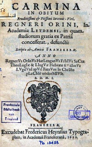 ASF 1561 16.10.1615 Reinerus Rombertus Orinius, hum. primum musis devotus; Joh. Makowsky, Christianus Otterus, Johannes Mandeville, L.J. Sylvius, Bernhardus Danielius en Abelus Moda schreven gedichten n.a.v. het overlijden van Regnerus Orinus; in het hart getroffen (hs. ill. titelblad) | Franeker | 16210617 |