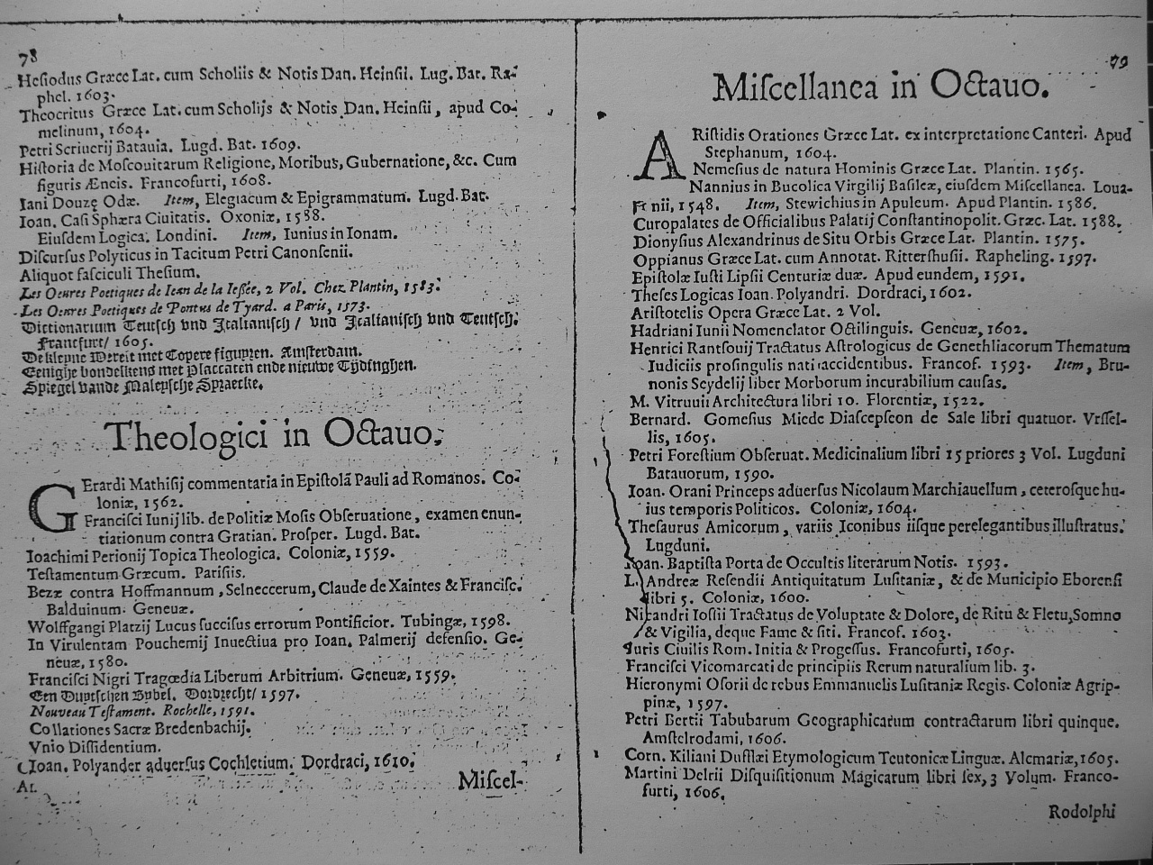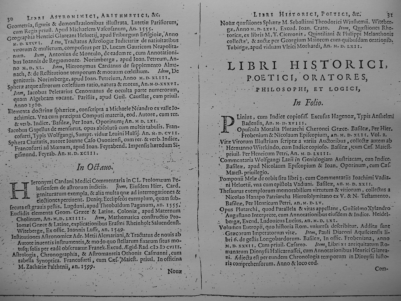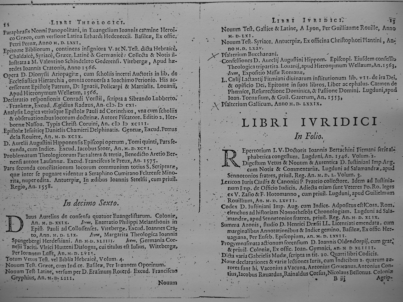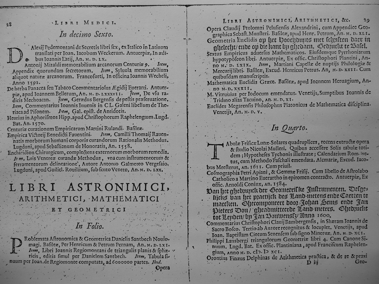 | Libri theologici in folio > 3 in quarto > 5 in octavo > 6 in decimo sexto > 12 Libri iuridici in folio > 13 in quarto > 14 in octavo > 15 in decimo sexto > 18 Libri politici in quarto > 19 in octavo > 19 in decimo sexto > 20 Libri medici in folio > 21 in quarto > 22 in octavo > 24 in decimo sexto > 28 Libri astronomici, arithmetici, mathematici et geometrici in folio > 28 in quarto > 29 in octavo > 30 |