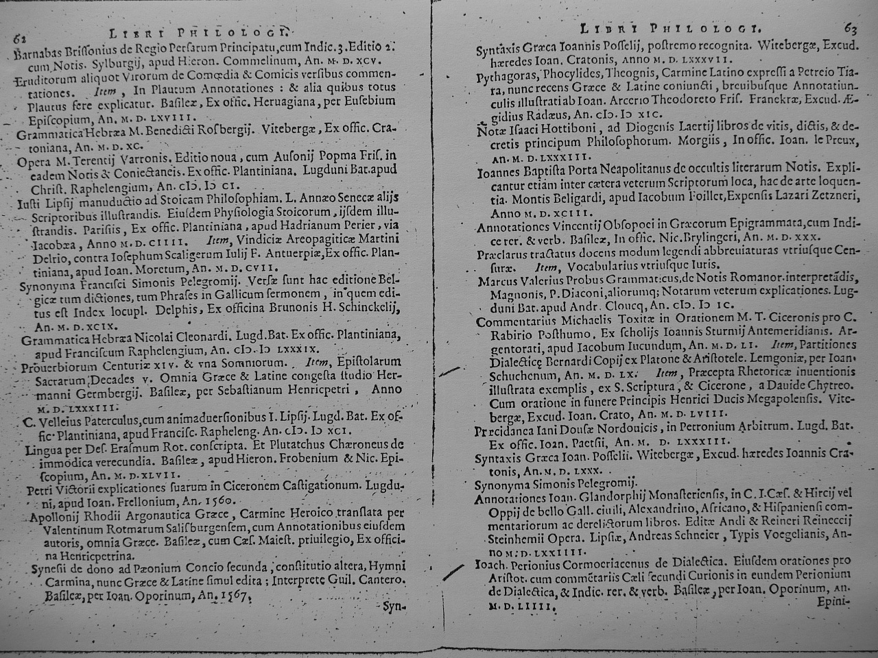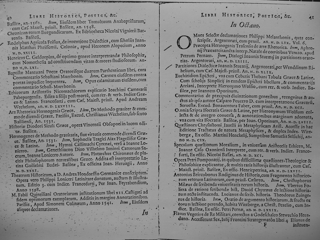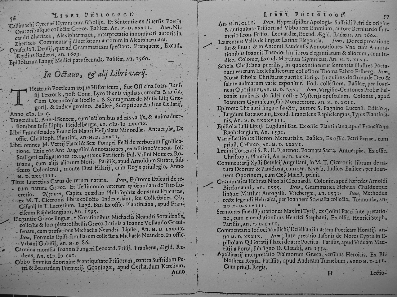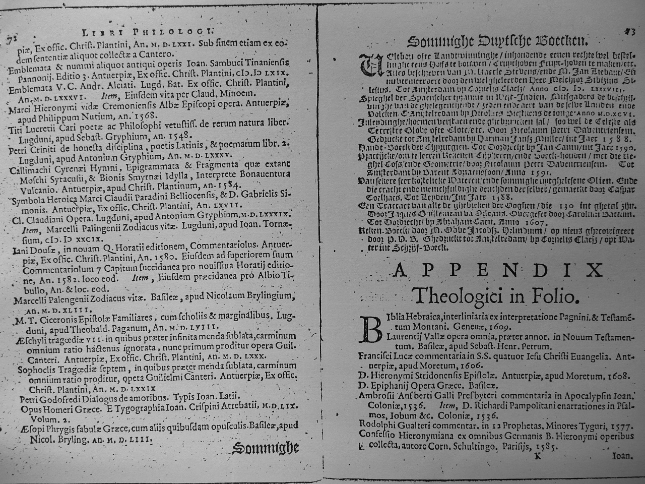 Libri historici, poetici, philosophi et logici in folio > 31 in quarto > 37 in octavo > 41 in decimo sexto > 51 Libri philologi in folio > 53 in quarto, & alii libri varii > 54 in octavo, & alii libri varii > 56 in decimo sexto, & alii libri varii > 71 Sommighe Duytsche boecken > 73 Appendix Theologici in folio > 73 Miscellanea in folio > 74 Theologici in quarto > 76 Miscellanea in quarto > 76 Theologici in octavo > 78 Miscellanea in octavo > 79 In 12 & 16 > 80 |