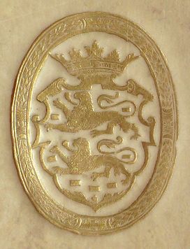 goud een gekroond wapenschild gedragen door twee leeuwen gestempeld; het