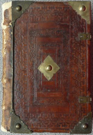 houten borden bekleed met leer op kartonnen platten overtrokken met perkament.