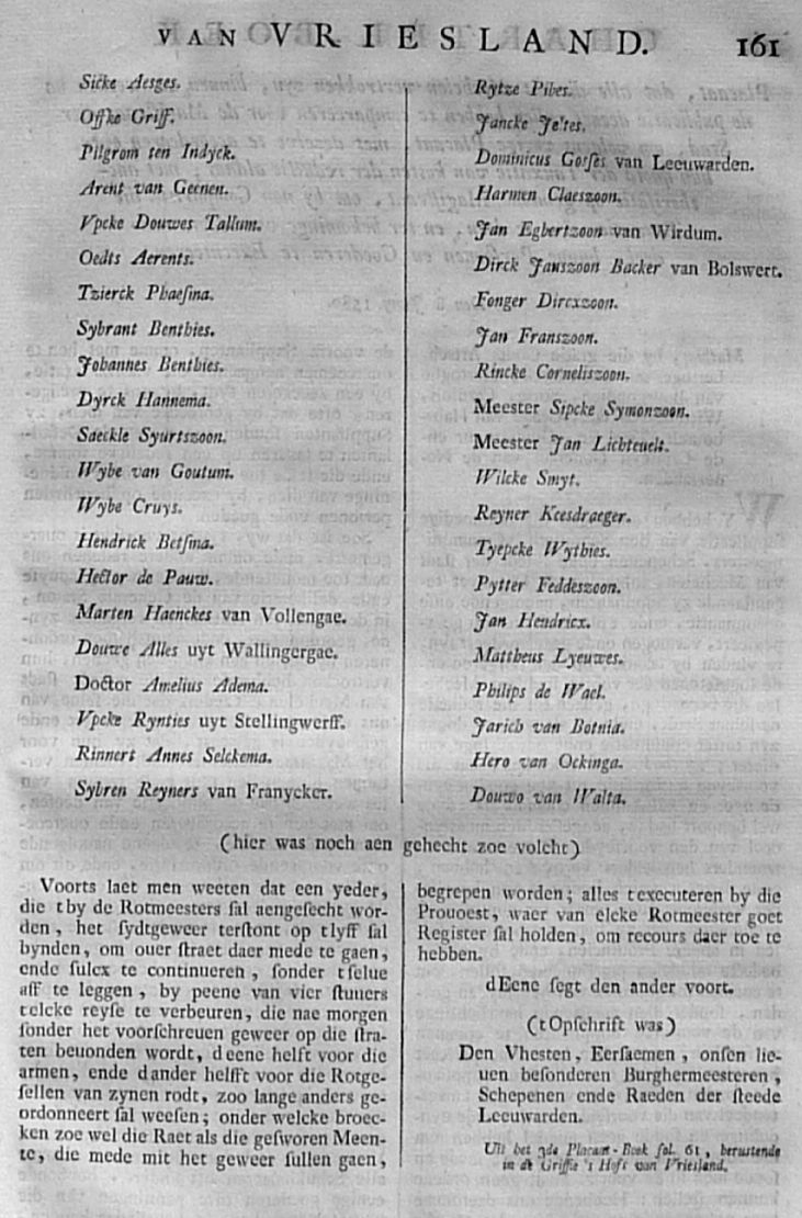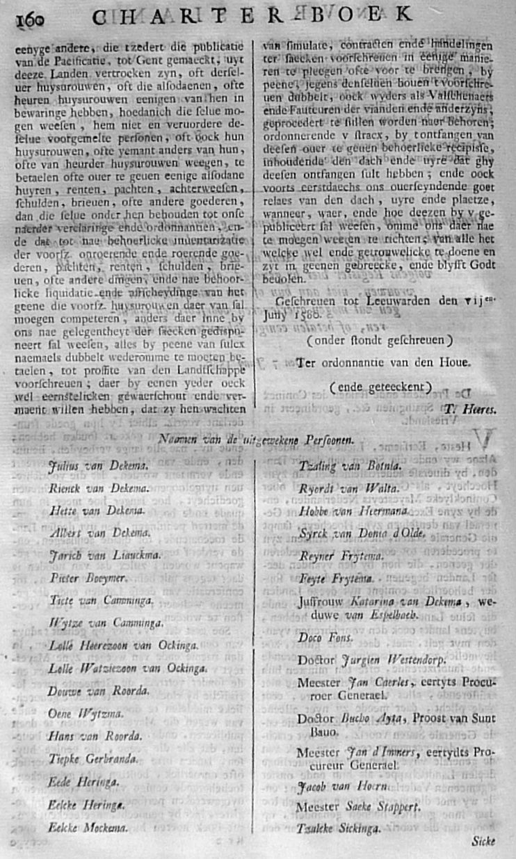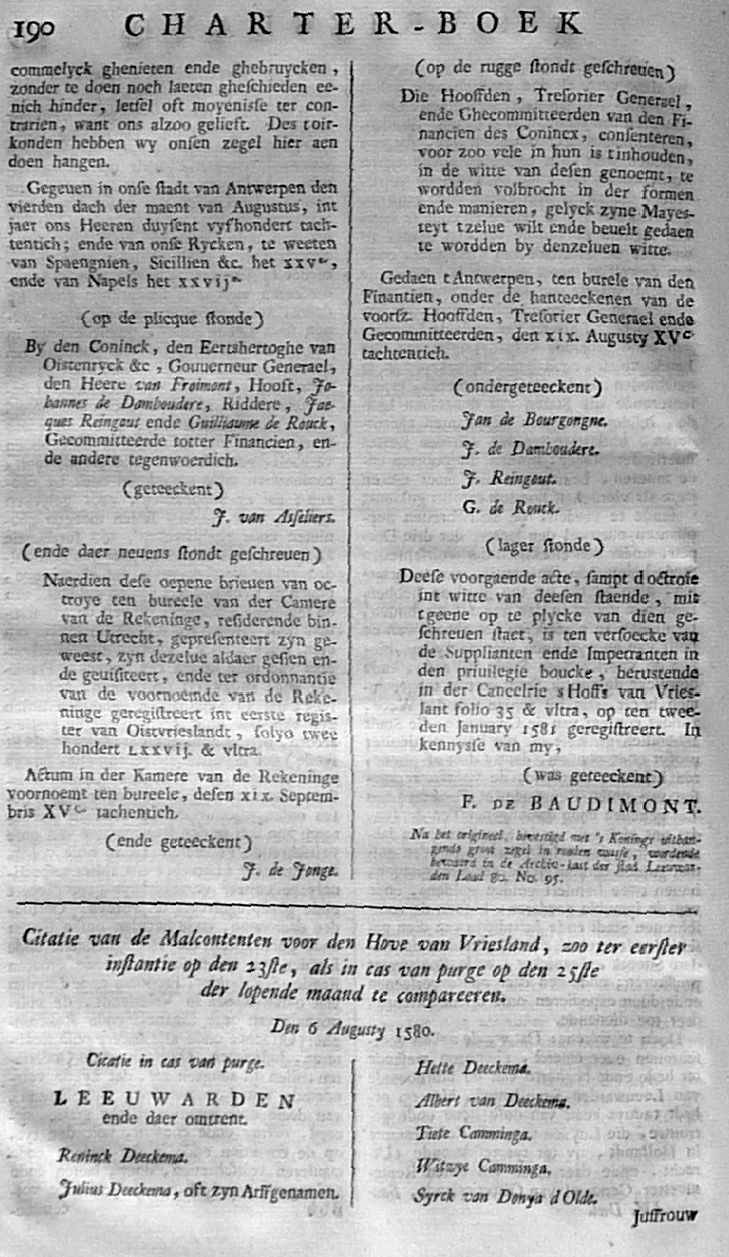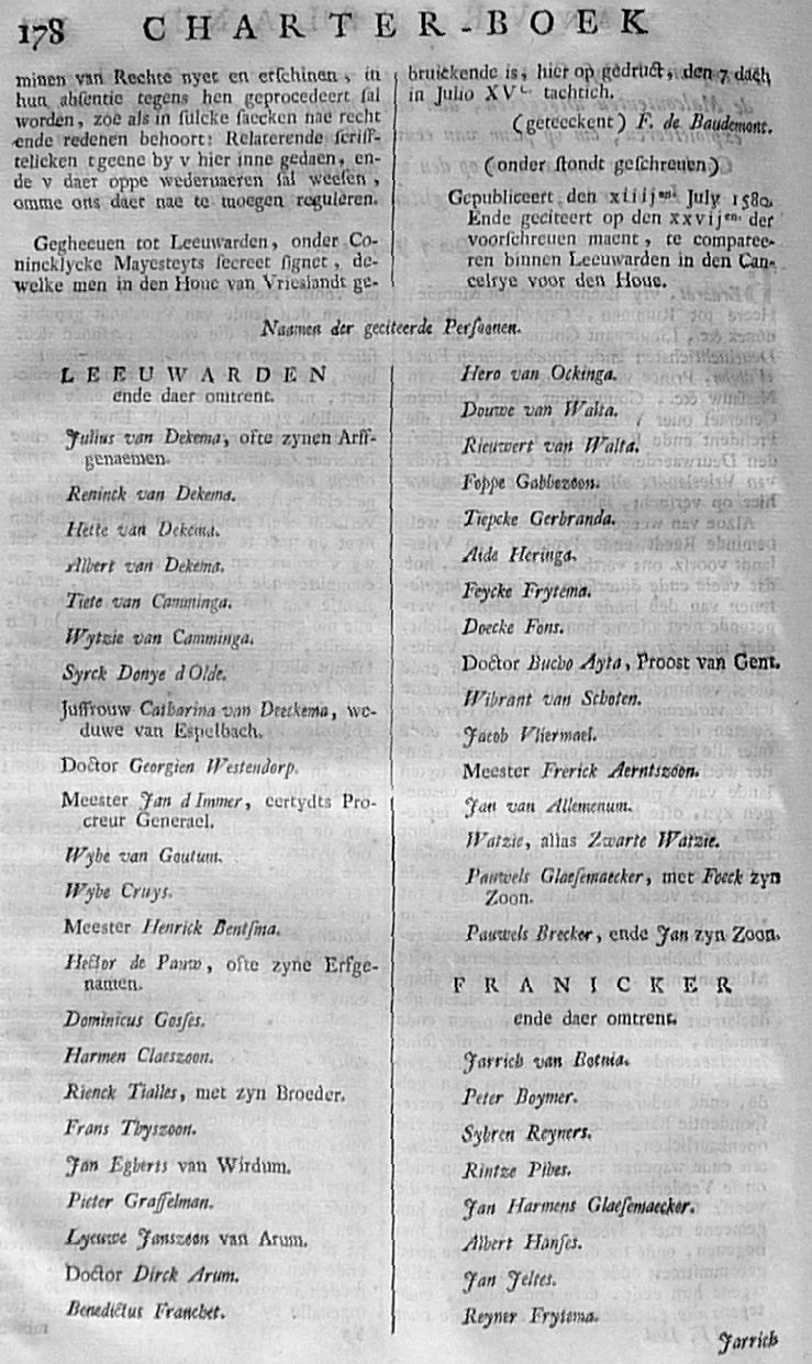 Citatie ... Malcontenten ... om op poene van eeuwig Bannissement en Confiscatie van Goederen, te compareeren op den 27 aanstaande in de Cancellarye binnen Leeuwarden; met een register der Gedaagden