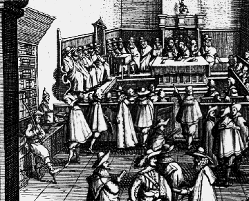 Blijkens de gravure op het titelblad van de verderop nogmaals te noemen Decisiones Frisicae, voor het eerst in 1635 gedrukt, bevond zich in de publieke ruimte van de grote zaal (rolzaal) een boekenkraam bestaande uit een afsluitbare boekenvoorraadkast met daarvoor een toonbank. De gravure is van de hand van de kunstenaar, die ook de titelprent maakte voor Hugo de Groots Inleiding tot de Hollandsche Rechts-Geleertheyt ('s-Gravenhage 1632).
