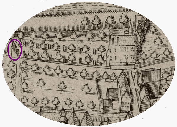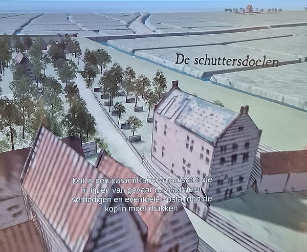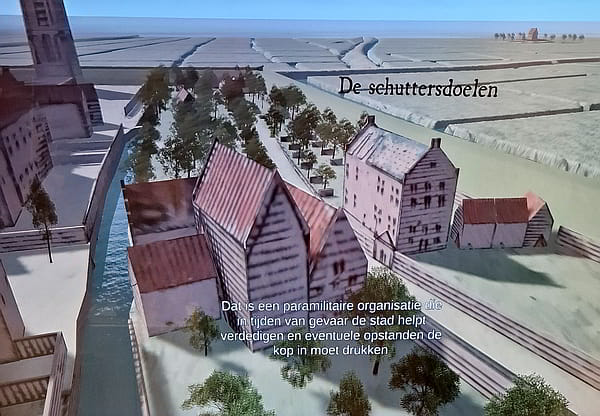 Uit de 3D-weergave van de plattegrond 1603: De twee schoorstenen zijn niet in 3D weergegeven. Zouden de afstandmuurtjes niet paaltjes met aanduiding van de schietafstand geweest zijn? In plaats van de boom aan het einde midden op de schietbaan had de kiosk met de doelschijf getoond moeten worden; zie de afbeelding hieronder. ![]() ![]() ![]() ![]() >> begin |