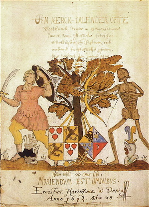 1501 • 4 Oct. Liet Graeff Huygo Leysennach, stadtholder van Frieslant, Douwe van Galama van Ackrum tot Sneeck aentasten ende in bewaeringhe stellen, omme dat hij over sijn tijt ende geleyde hier int lant bleeff. Hij worde terstont tot Franiker ghefoert, ende hoewel daer veel heerschippen waeren vergaedert, om hem te verbidden, liet graeff Huygo hem niettegenstaende dien den 8 Oct. des morgens voer ses uren op Syaardemahuys heymelijck onthooffden. 1503 • Schelto Lyauckema, Luttie oft Luts Haarsma man, tot Sneeck begraven • 31 Mar. Bot Hubbema, ende leyt bij Taco Glins ende Haebel Haensma begraven tot Dronrijp ![]() 1505 • Tet Haarsma in der IJlst bij Sneeck sterff 13 April. anno 1505 • 5 Maii Hessel Jelgers Feytzma, His [ ] man, tot Huysum begr. • Op S. Gregorii avont [= 12 maart] Bocke Aggez. Burmania, Sytie Kamstra man, tot Minnaert begr. [met tekening wapen] • Op S. Mechielsdach [= 29 september] Tiete Hummama, tot Dronrijp • Primo [= 1] Aprilis obiit vir nobilis Syds Sythiema grietmannus de Ferwerderadeel, Womck Juckama man, tot Hallum begraven 1506 • Sept. Sterff Philippus de 1., coninck van Spangien, vaeder van Carolus de 5., tot Bourges in Spangien niet sonder suspitie van venijn 1509 • 15 Sept. Sywert Aelva in een hoechwaeter verdronken • 17 Januarii Sypt Jeppama op S. Anthonisavont. Hij voerde Goslinga-waepen ende leyt tot Marrum bij Feyo Jeppama begraven 1510• 4 Dec. Auck Auckema ende Kempo Donia haer man, tot Jelsum • Op S. Eufemii dach [= 20 januari] sterff Worp Juckma ende leyt tot Hallum begraven, voerende dit [hiernaast getekende] wapen • 4 Dec. op St. Jacopsdach [= 25 juli] worde Mr. Pieter Auckema tot Leewerden in de tweedracht van de burgers onnoselijcken op Uniastins tot Wirdum dootgeslaegen. His uxor eius Rynia. 1512 • Worden Jemme heer Juwsma ende Tzyaert Mockama als verraders des vaderlants van den Stadtholder van Vrieslant onthooft ende tot de Minnebroeders in die kercke laeten begraven • 5 Junii Rienck Popma, Rieme [ ] man, tot Menaem begraven • 4 Julii Sterff Focko Ropta, Graets Eysinga man • 24 Junii Graetz Eysinga, Focko Ropta wijff ende leggen beyde tot Metselwyer begraven. Haer vyer quartieren waren Ropta, Meckma, Eysinga, J[u]wsma, twelck was een enkel arent met een leu opt borst gelijck die van Sterkenburch nu ter tijt voeren • Sterff Bajazeh Tursche keyser, aeta. 74 1513 • 27 Junii Rienck van Andla ende Jets Groustins sijn wijff, tot Weydum • Kempo Donia ende Auck Auckema sijn wijff, tot Jelsum 1515 • 6 Julii Sydts Emega, Ansck Loonya man, in Galeyen begr. • 1 Martii Goffo Goffezoon Abygha ende leyt tot Steens in de kerck begraven 1516 • Worden Eepo Douma ende Abba Saskers Heeringa sijn swaeger van den Boergoenschen tot Harlingen onthooft • Worde Popcko Gabbama oft Hyeemstra (die goet Geldersch was) in een slach bij Gheenum van den Burgoenschen in sijn [ ] ghewont daer hij corts aen sterff 1517 • Op S. [ ] Sytie Kamstra, Bocko Aggaz. Burmania wijff, tot Hinnaert begraven • Epitaphium Alberti Crantz, inscriptum monumento in caemiterio summi templi Hamburgi, anno 1517 in vigilia conceptionis virginis matris gloriosae [= 8 december], spectabilis ac egregius vir Dominus Albertus Crantz, Sacrae Theologiae ac Decretorum eximius Doctor, ecclesiae Hamburgensis canonicus. lector facundissimus doctissimusque, & olim decanus: morum virtutum specimen & exemplar, patriae decus, feliciter concessit in fata, cuius anima cum beatis molliter quiescat. Amen. 1518 • Johannes Reuchlinus sive Capnio, Germanus, Pfortzensis, obiit in patria magnis auctus honoribus 1520 • 20[?] Sept. Lollo Ockinga, Aelke Harmana man, Dronrijp 1521 • 28 Dec. Auck Harinxma, Romcke Hoeytsma wijff, tot Sneeck begr. • 28 Maii J[u]w Aelva, tot Lewerden in Jacopijnen in de Noordertrans beg. 1522 • 14 Sept. De moeder [Ath van Sjaerdema] van Rienck Burmania D.V.I. Caes. Mat. Conciliarius, tot Oldehooff • 9 April. Rienck Campstra ende Gerlant Hoxwyer sijn wijff, Galeyster • 20 Sept. Hette Deeckma, Reynsck Campstra man, in Galeysterkerck • 23 Octob. Womck Juckama, Sydts Sitzma wijff, Hallum begraven 1524 • 4 Julii Jetz Groustins ende Rienck van Andla haer man, tot Weydum 1525 • 21 Junii Jantien Walta ende Pieter Donia haer man, tot Jelsum beg. 1527 • 4 Junii His [ ], Hessel Jelger Feytsma wijff, tot Huysum beg. • 10 Apr., dat was doen Paeschmaendach, sterff heer Sibren, Doecke Douwama zoon, pastoor tot Marssum • 8 Mar. Howelynck Sycko Lyauckama stalmeyster Cot. Mat. Olderman, Imck Minnama man, tot Sneeck beg. • 9 Nov. Heer Joh. Hiddama pastoor, tot Dronrijp 1528 • Op S. Thomisavont [= 21 december] sterff vrou Luttie oft Lutz Haarsma man • Schelto Lyauckama wijff, tot Sneeck begraven 1529 • 7 Oct. Feddo Doetinga ofte Dottnya, tot Marsum begraven • 4 Octob. Aemko Jarla grietman van Bergumerdeel ende leyt tot Hantumhuysum begraven • 22 Oct. Tziemck Eminga, Ruerd Feytsma wijff, tot Deynum begraven 1530 • 31 Decemb. Catharina Offenhuysen ende Douwe Aebinga haer man, Oldehooff • Naedat Jancke Douma van Oldeboorne den Hoeve suspeckt geworden was, is tot Meechelen ghevancklijck aenghetast ende tot Wilfoorden gheweest, daer hij a[nn]o 1530 sijnen natuerlijcken doot (soe men seyde) ghesturven is 1531 • 6 Oct. Wert Ulricus Swinglius verslaegen te Capelle in Switzerlant • 2 Apr. Peye Lyuwens ut Gronigerlant, die eerste huysvrou van D. Kempo Martna R. ende R. in den Hoeve van Vrieslant ende leyt in Galeysterkerck begraven 1532 • 6 Junii Gosse Gosseszoon Abiga ende Syrckyen Donya sijn wijff, ende leyt in Galeysterkerck in de Noordertrans begraven • 2 Octob. Tet [ ], Jancke Unama wijff, tot Blij begraven 1533 • 27 Jan. Low Donya heerschip binnen Sneeck • 25 Oct. Ansck Loonya, Sydts Emega wijff, in Galeyen begraven • 22 Dec. Jeppo Stanniga sive Stania 1534 • 3 Julii Wyck Aebbinga, Worp Ropta wijff, Metselwyer begr. 1535 • Syrck Donia, Syts Hemmama man, 28 Janua. tot Menaem begraven • Op S. Blasiusdach [= 3 febr