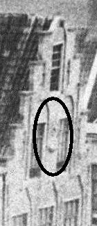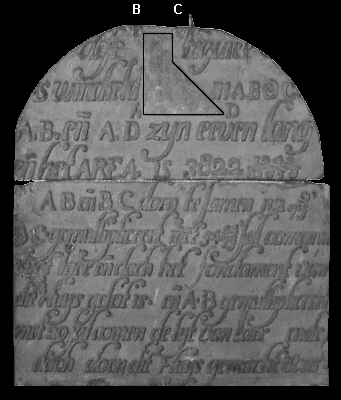 rekenvraagstuk op een gevelsteen. Gegeven is AB + BC = 112 9/73; d.i. 8185/73. Dan is BC = 8185/73 - AB. Ook is de totale oppervlakte van de figuur gegeven (namelijk 3822 1249/10658), die uit twee gelijkzijdige driehoeken bestaat met zijden AB resp. BC. De oppervlakte van een driehoek berekent men als basis maal hoogte gedeeld door 2. Dus ½ AB2 + ½ BC2 = 3822 1249/10658. We kunnen deze vergelijking ook schrijven als ½(AB + BC)2 - 2AB.BC = 3822 1249/10658 ofwel ½.{(8185/73)2 - 2AB.BC}= 3822 1249/10658 ½.66994225/5329 - AB.BC = 3822 1249/10658 ofwel ½.66994225/5329 - AB.BC = 40736125/10658 AB.BC = 66994225/10658 - 40736125/10658 ofwel AB.BC = 26258100/10658 BC = 26258100/10658AB ofwel BC = 13129050/5329AB Deze laatste groen weergegeven waarde van BC is gelijk aan de eerste, dus: 13129050/5329AB = 8185/8249 - AB Links en rechts vermenigvuldigen met AB geeft 13129050/5329 = 8185/8249AB - AB2 ofwel AB2 - 8185/8249AB + 13129050/5329 = 0 ofwel AB2 - 1129/73AB + 24633723/5329 = 0 Deze vierkantsvergelijking is te ontbinden in AB2 - 30AB - 829/73AB + 24633723/5329 = 0 ofwel AB(AB - 30) - 829/73(AB - 30) = 0 ofwel (AB - 30)(AB - 82 9/73) = 0 De oplossing AB = 30 zou als datum van gereedkomen van de bouw (volgens de tekst op de