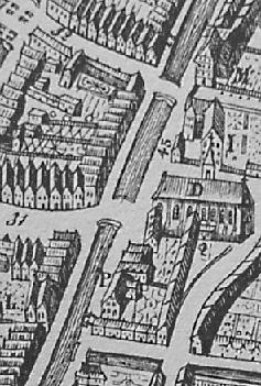 >> begin II. De Munt van Tweebaksmarkt naar Grote Kerkstraat >> begin Het detail uit de plattegrond van Leeuwarden uit 1664 laat zien waar de eerste, de oude provinciale