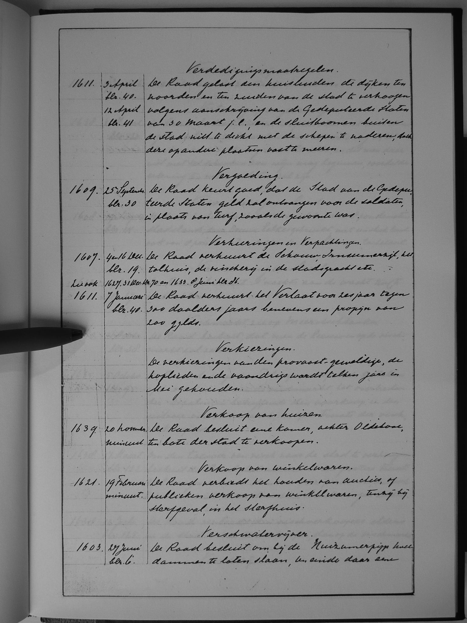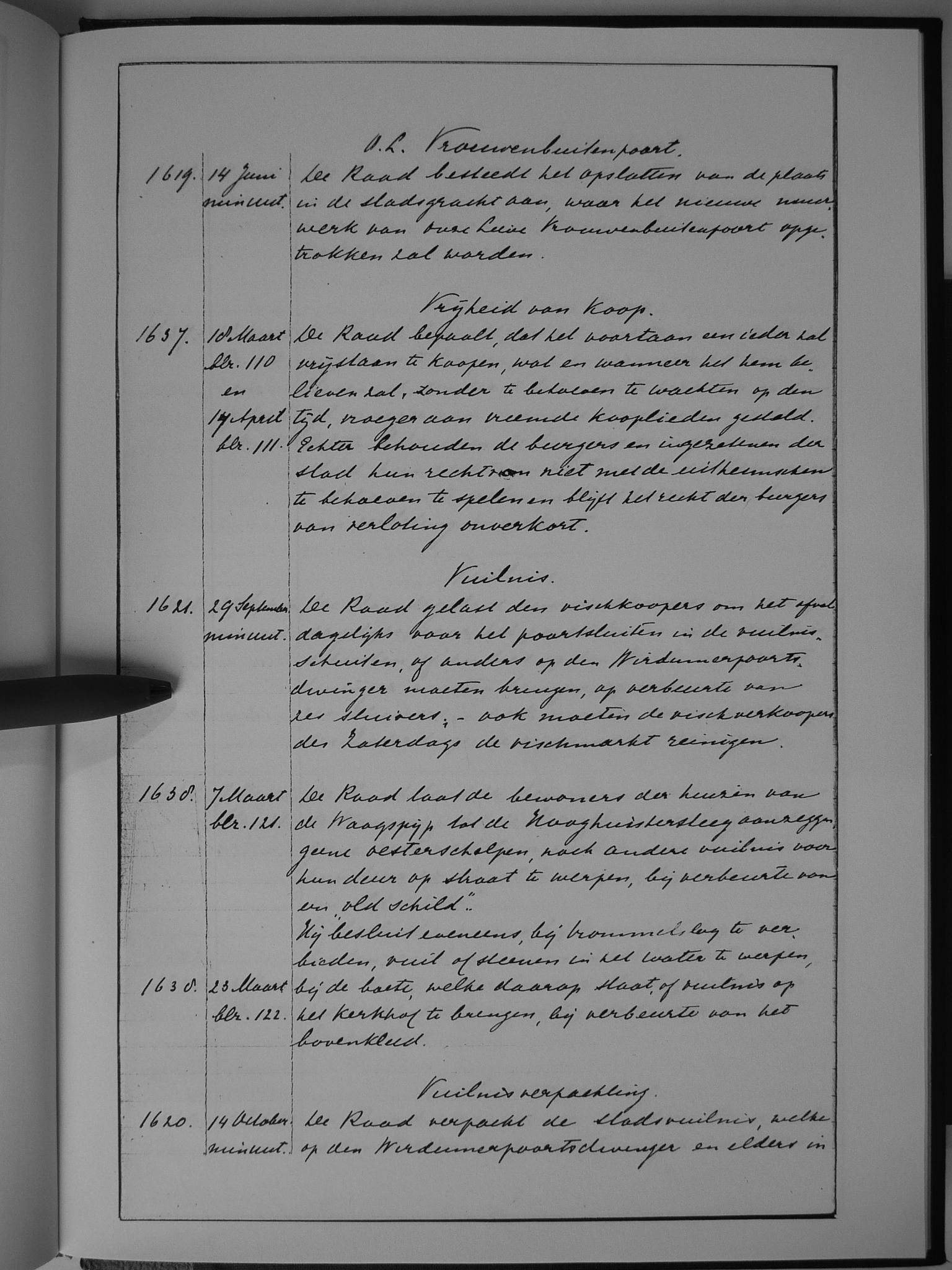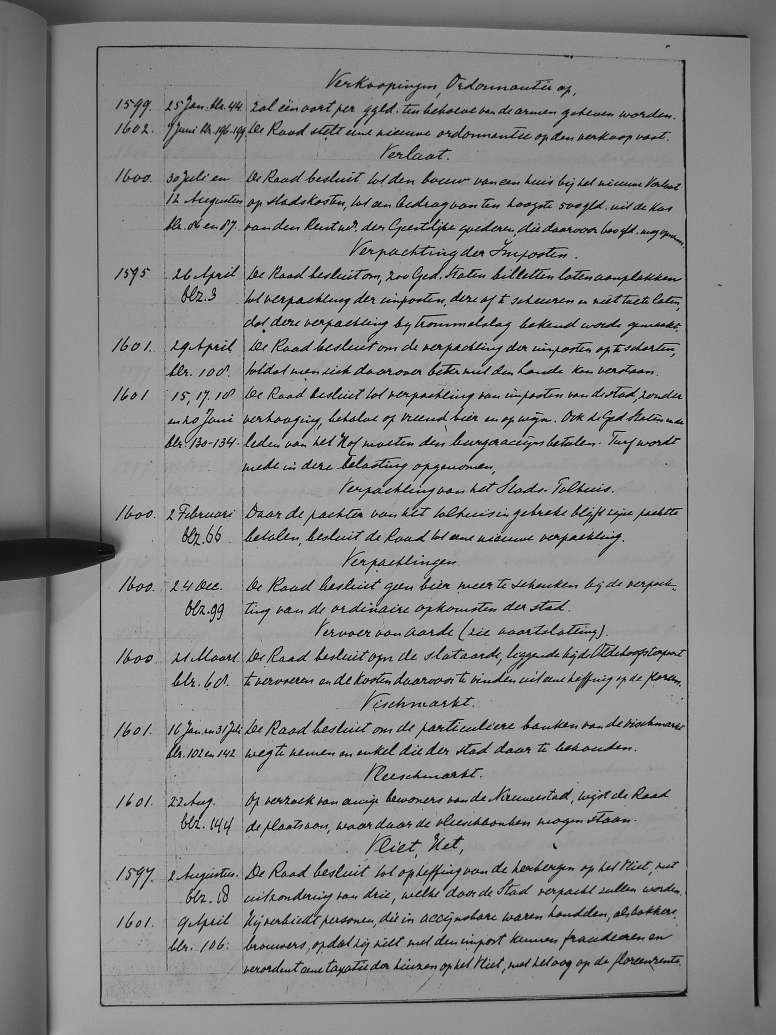 26 verkopingen, ordonnantie op; Verlaat; verpachting der imposten; verpachting van het Stads-Tolhuis; verpachtingen; Vismarkt; Vleesmarkt; Vliet, het