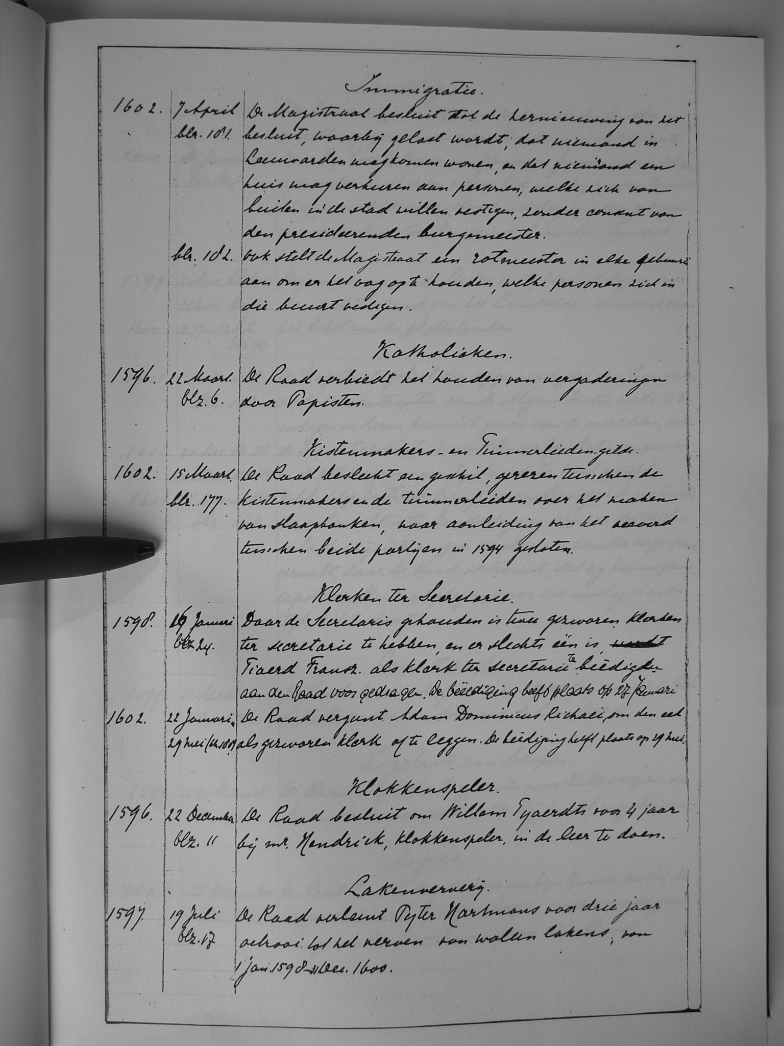 14 immigratie; katholieken; kistenmakers- en timmerliedengilde; klerken ter secretarie; klokkenspeler; lakenververij