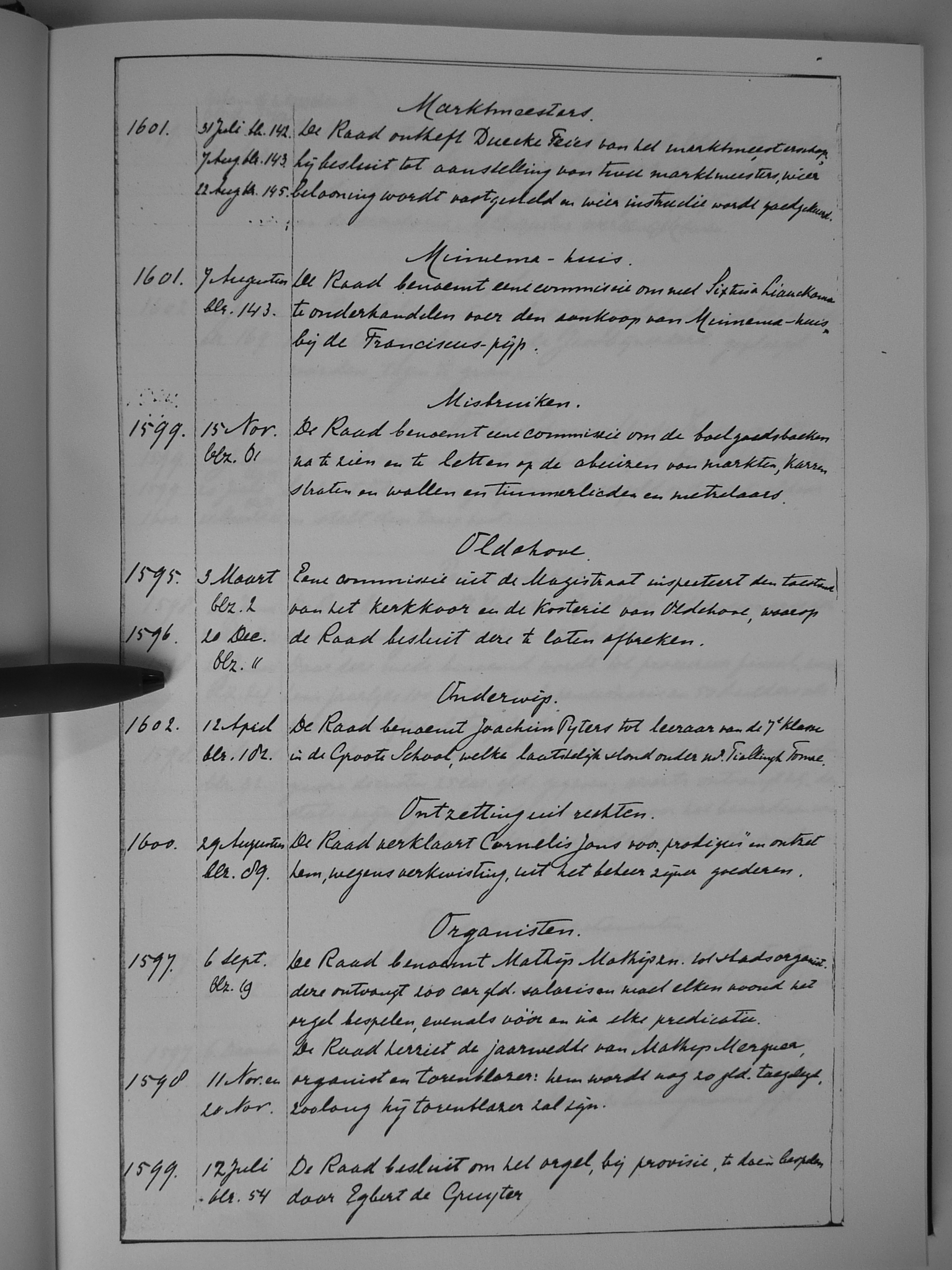 16 marktmeesters; Minnema-huis; misbruiken; Oldehove; onderwijs; ontzetting uit rechten; organisten
