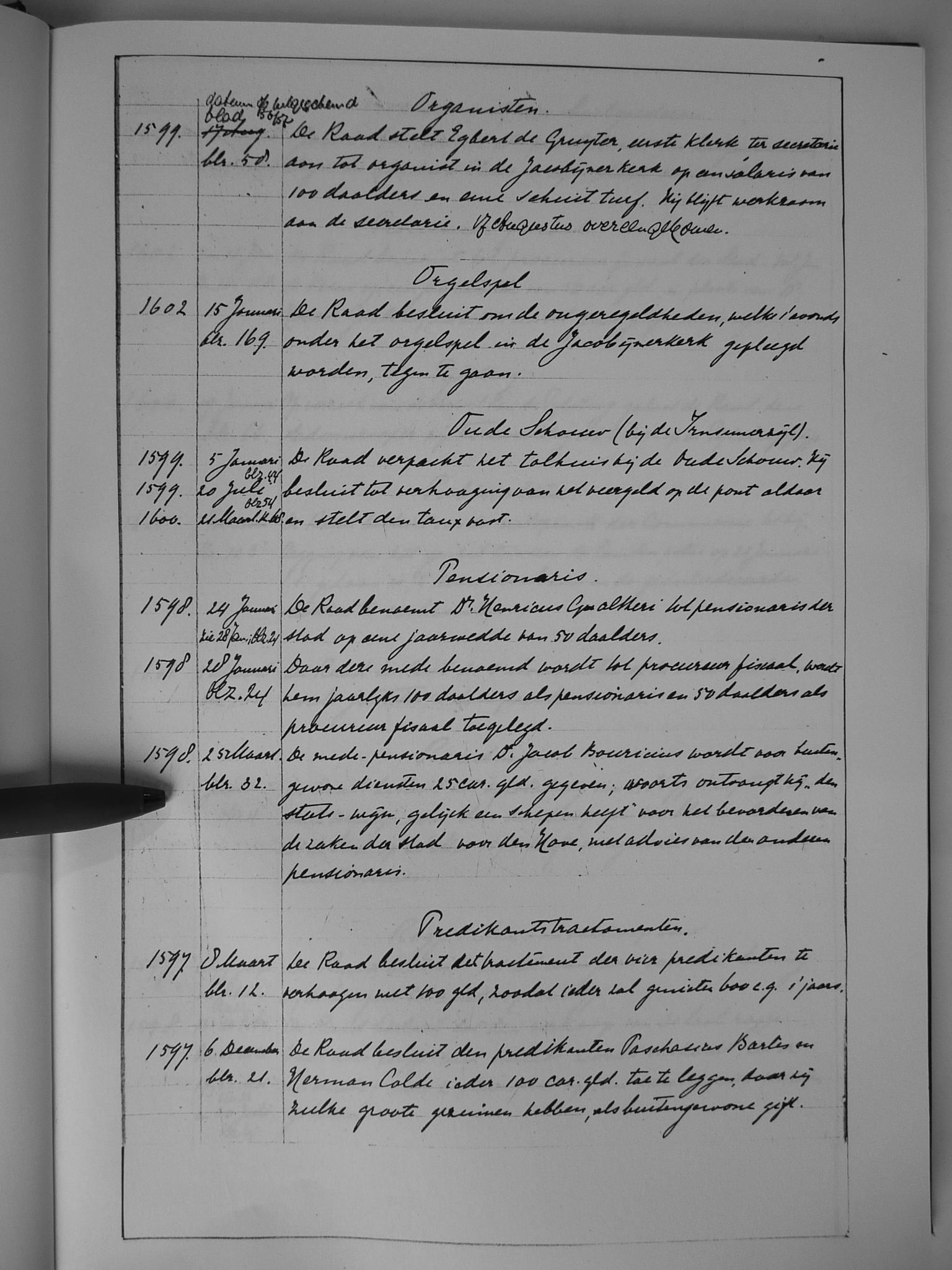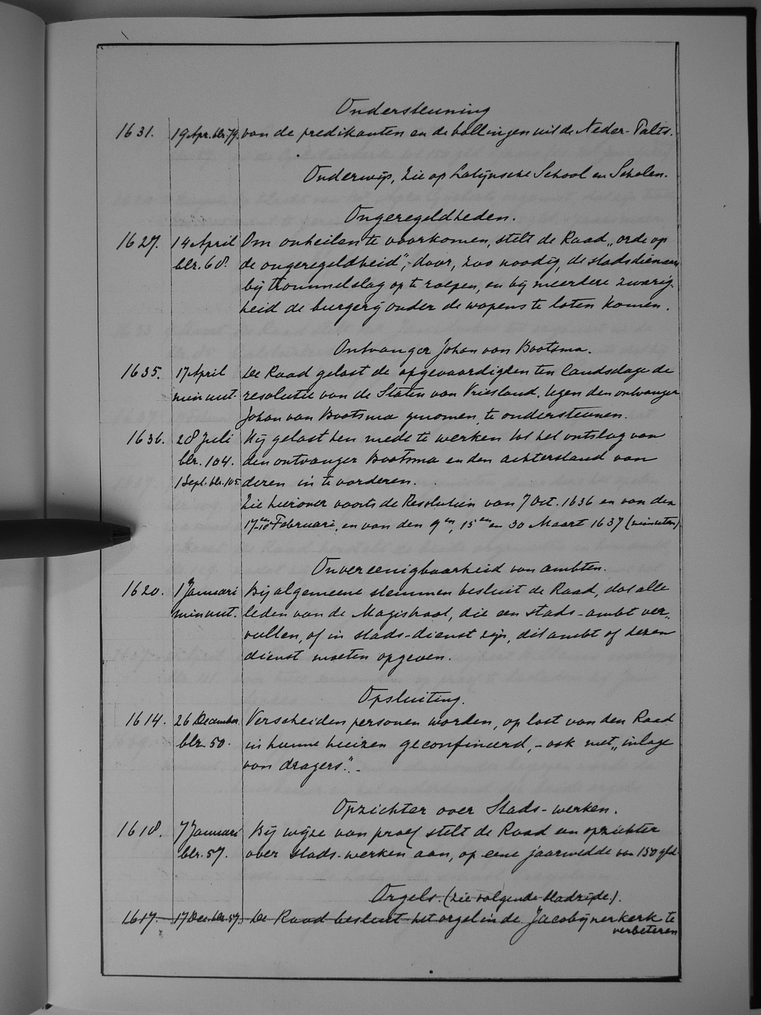 39 ondersteuning; onderwijs (zie: Latijnse school, scholen); ongeregeldheden; ontvanger Johan van Bootsma; onverenigbaarheid van ambten; opsluiting; opzichter over stads-werken