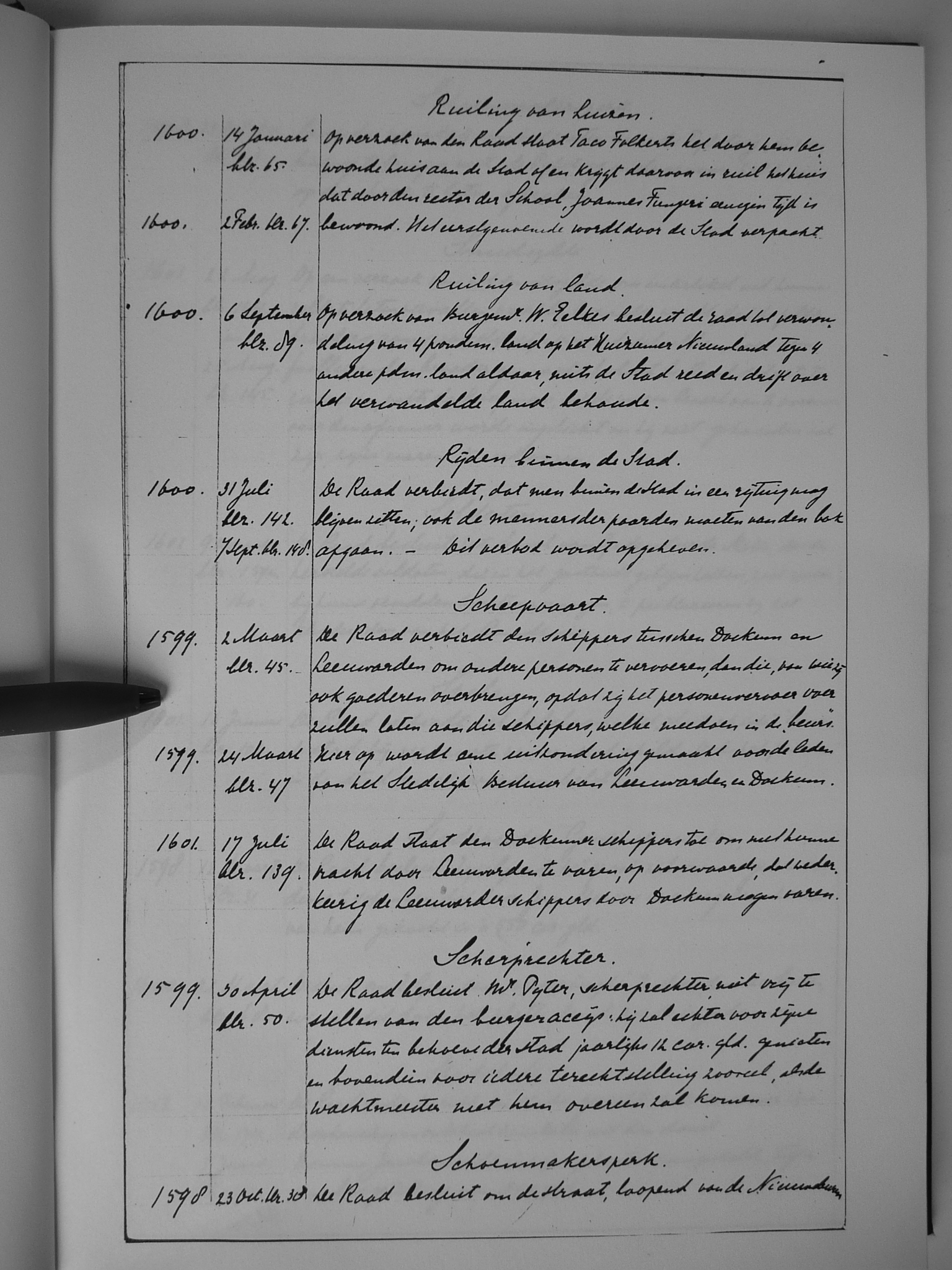 19 ruiling van huizen; ruiling van land; rijden binnen de stad; scheepvaart; scherprechter; Schoenmakersperk