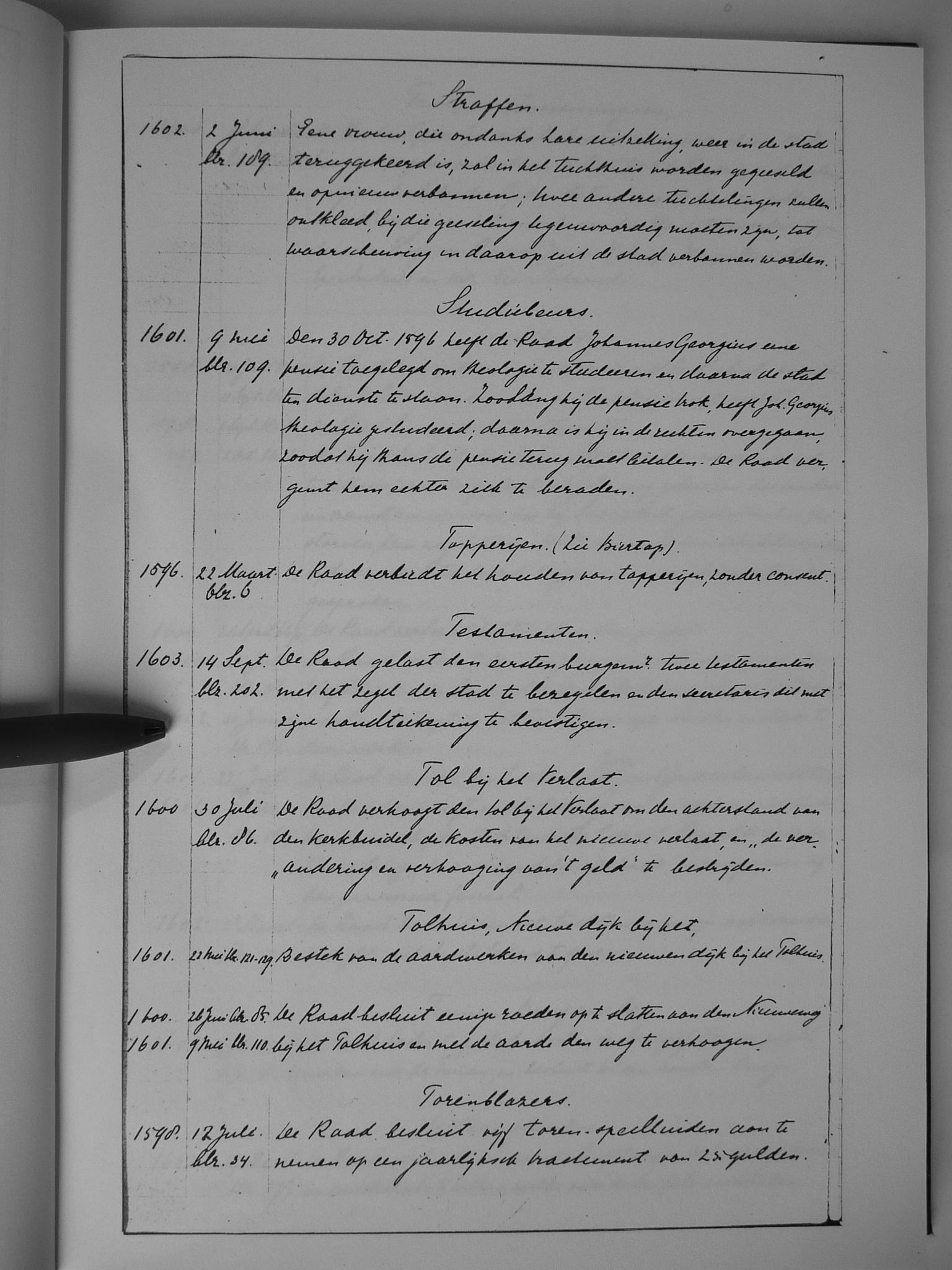 22 straffen; studiebeurs; tapperijen (zie ook: biertap); testamenten; tol bij het Verlaat; tolhuis, Nieuwe dijk bij het; torenblazers