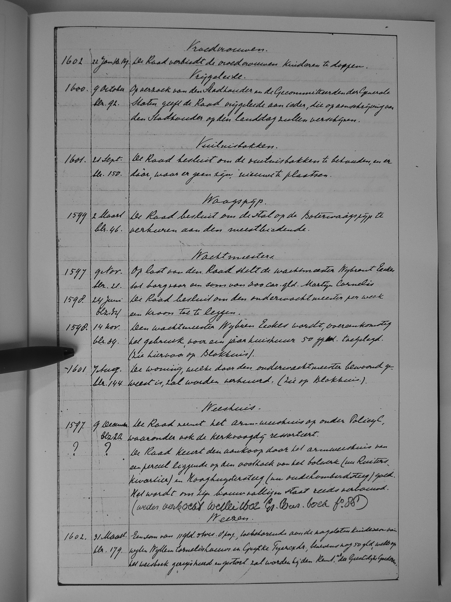 27 vroedvrouwen; vrijgeleide; vuilnisbakken; Waagspijp; wachtmeesters; weeshuis; wezen