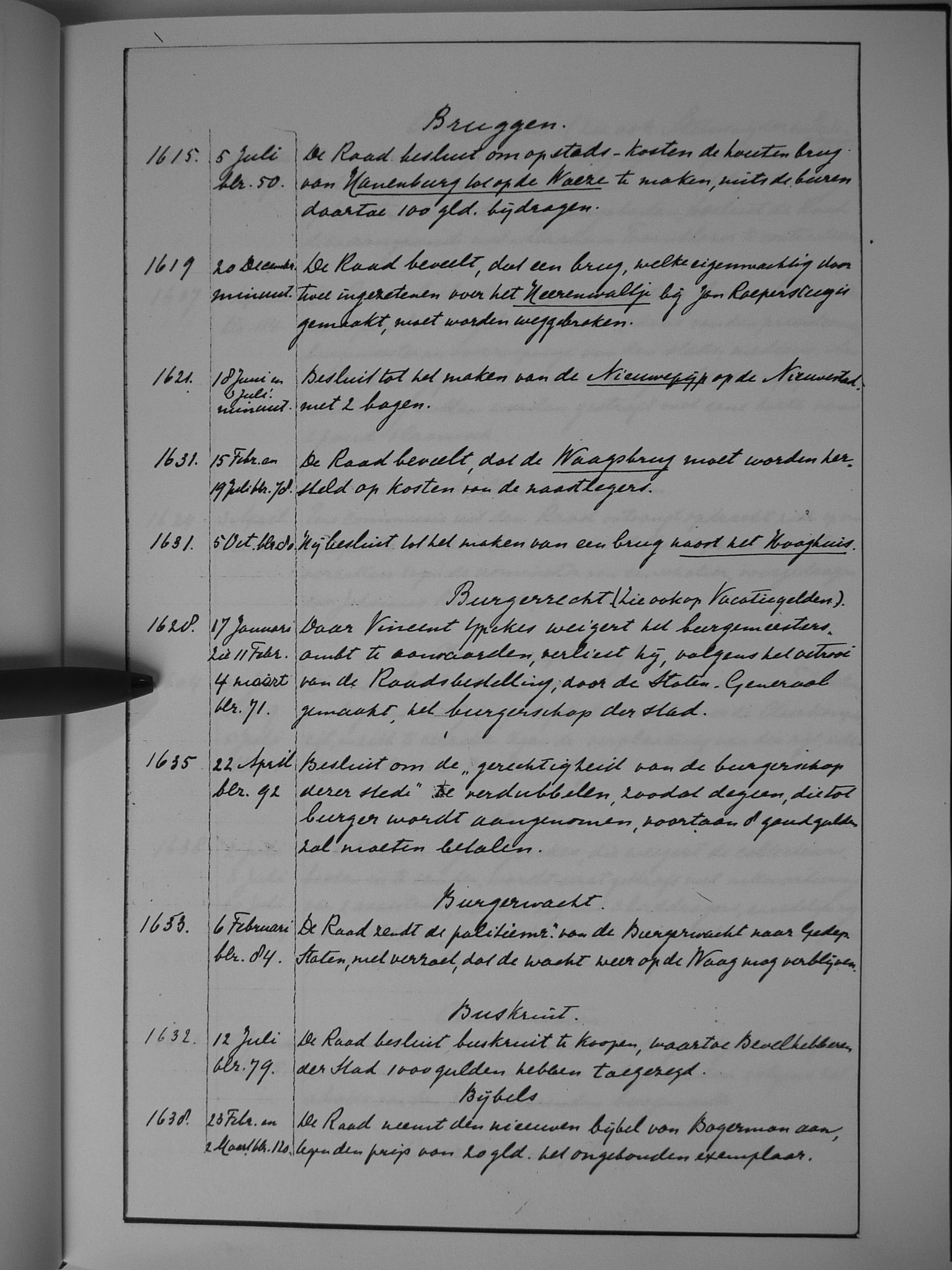 13 bruggen; burgerrecht (zie ook: vacatiegelden); burgerwacht; buskruit; bijbels