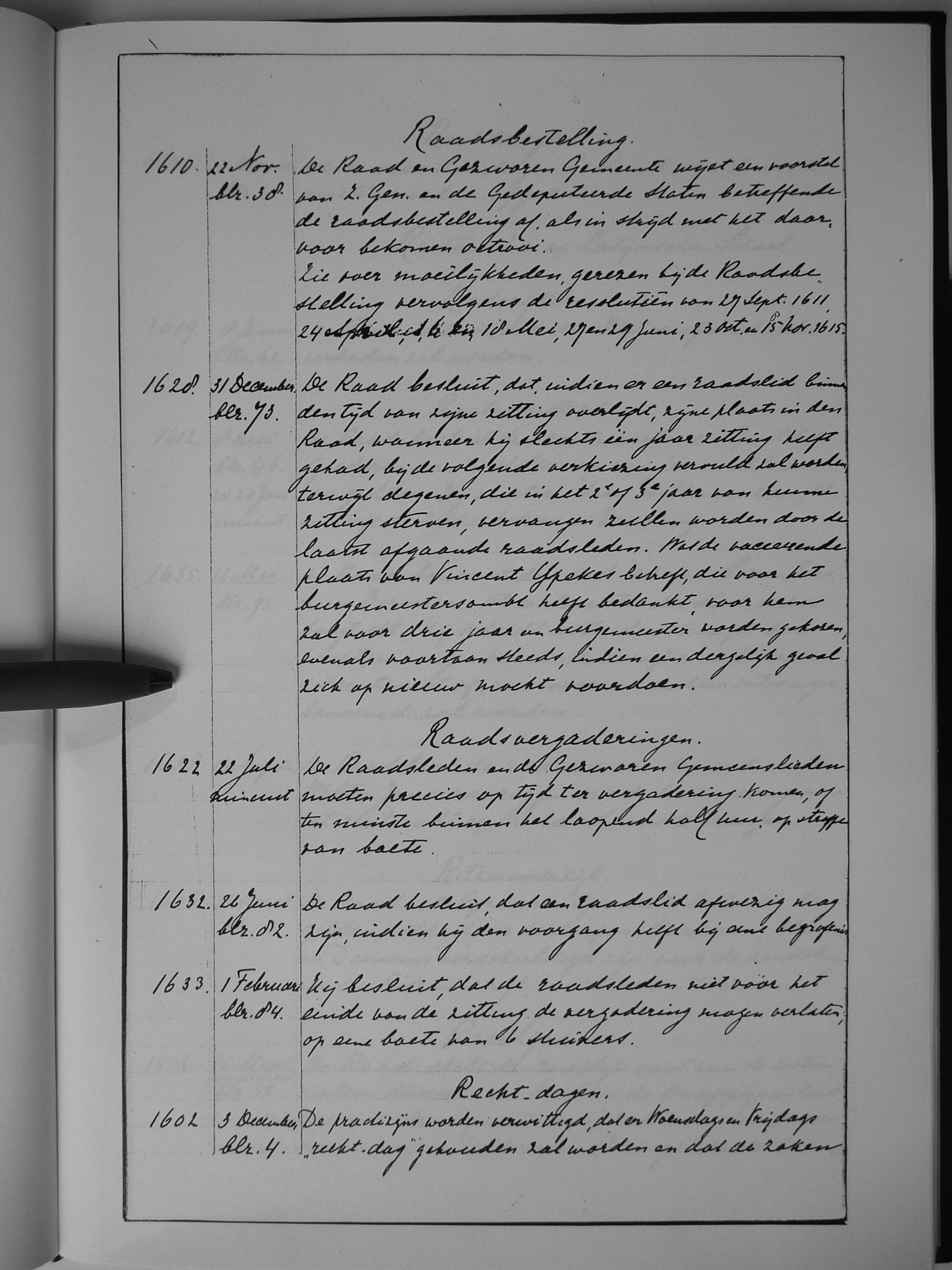 56 raadsbestelling; raadsvergaderingen; recht-dagen