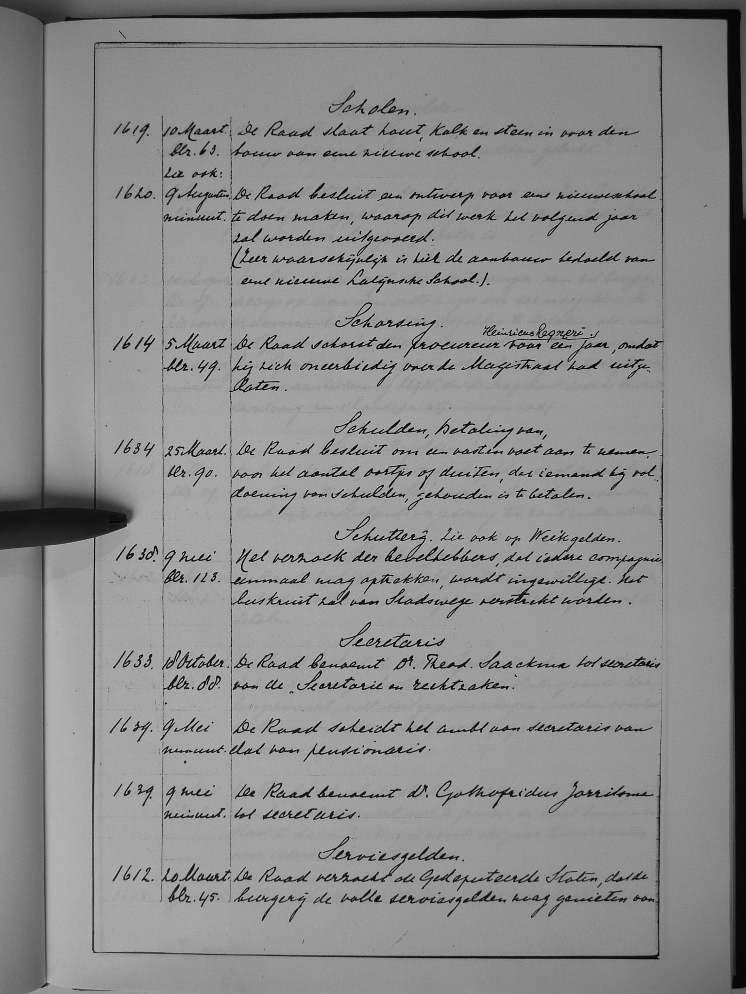 60 scholen; schorsing; schulden, betaling van; schutterij (zie ook: weekgelden); secretaris; serviesgelden