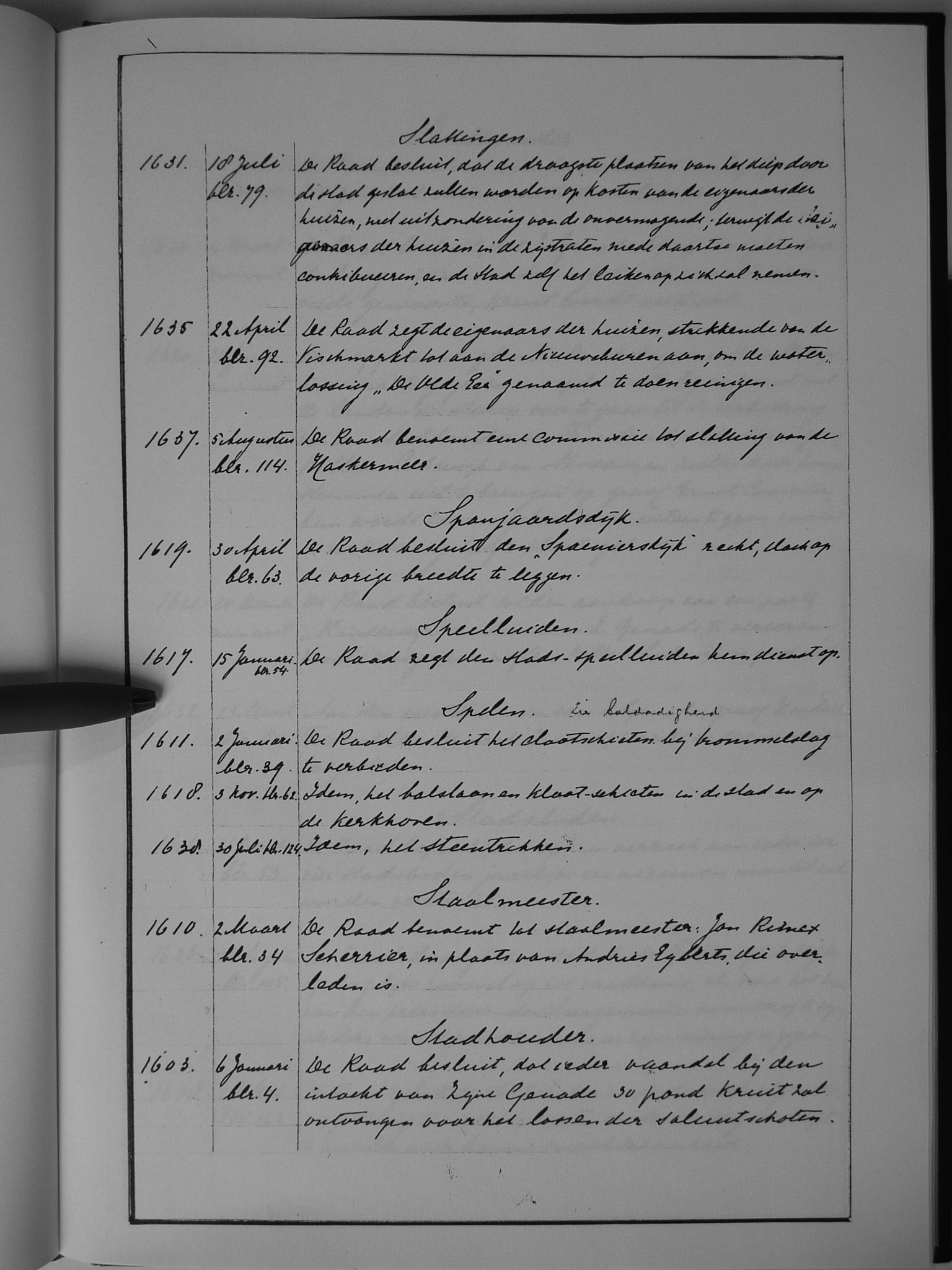 63 slattingen; Spanjaardsdijk; speelluiden; spelen (zie ook: baldadigheid); staalmeester; stadhouder