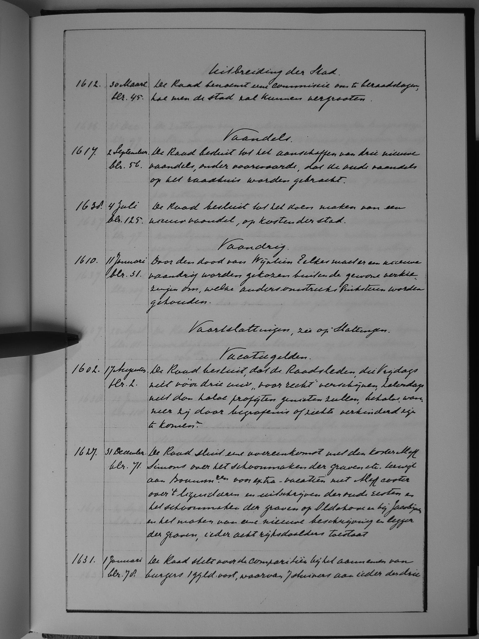75 uitbreiding der stad; vaandels; vaandrig; vaartslattingen (zie slattingen); vacatiegelden