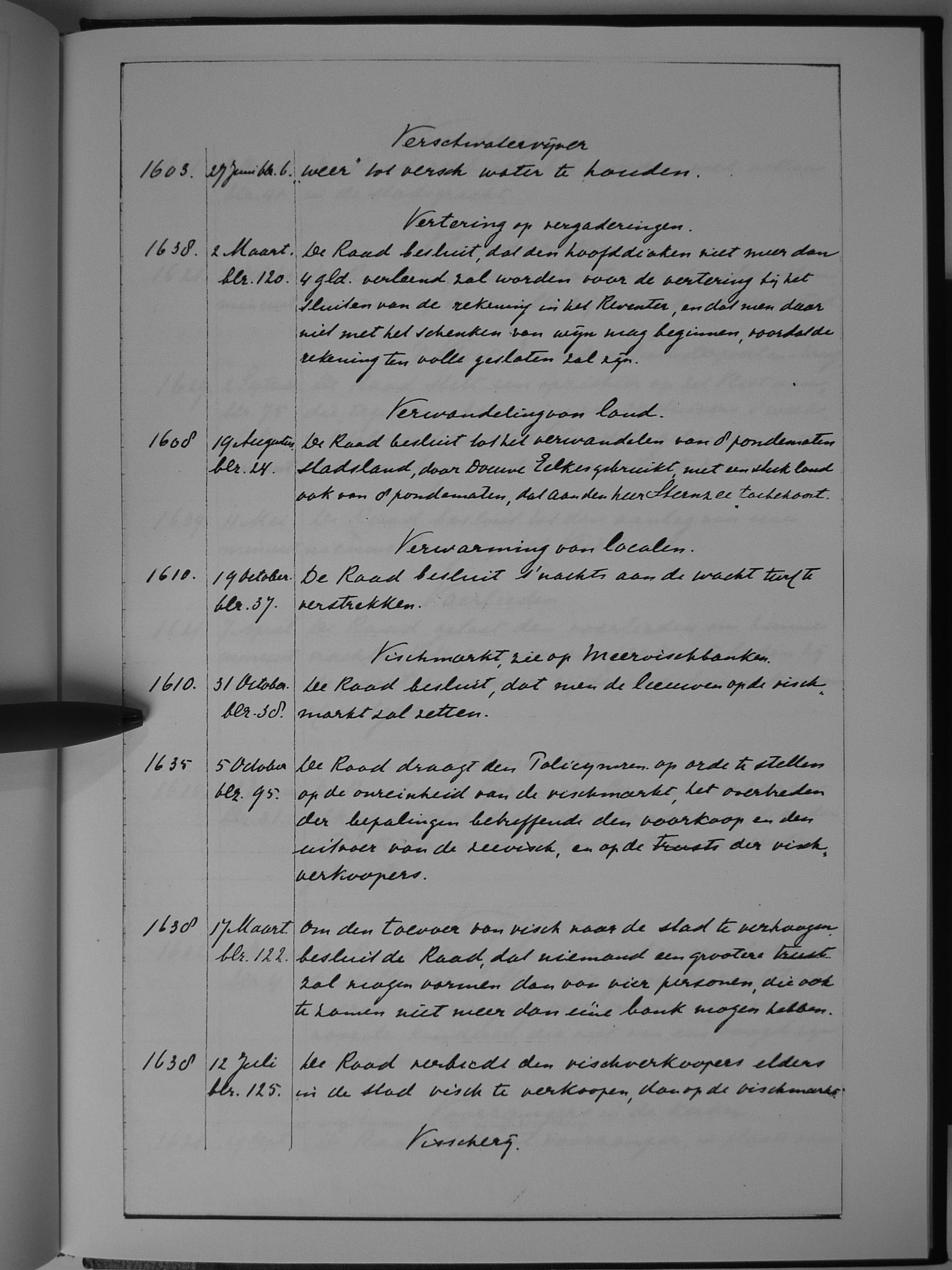 79 verswatervijver; vertering op vergaderingen; verwandeling van land; verwarming van lokalen; Vismarkt (zie ook: meervisbanken)