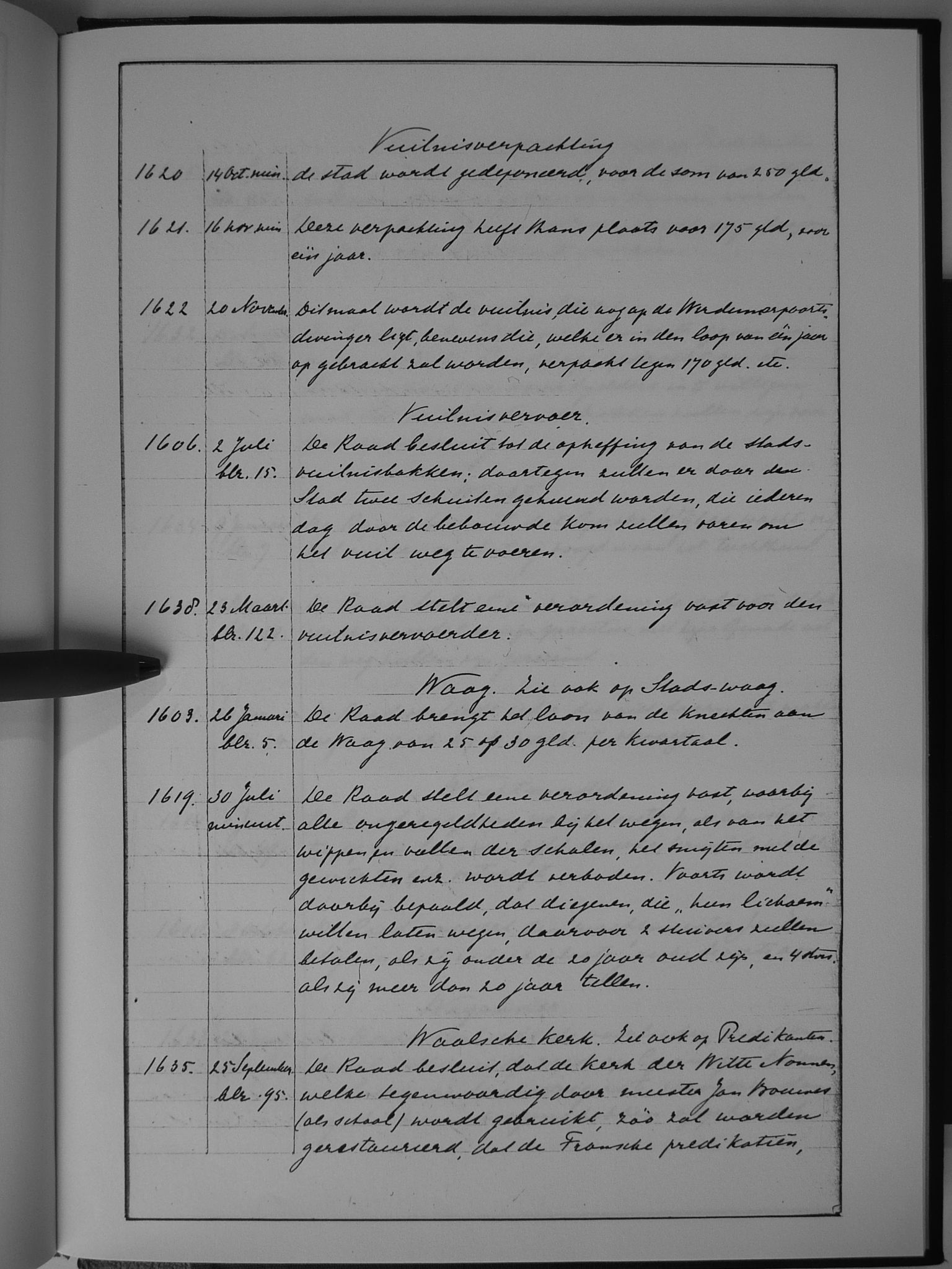 83 vuilnisverpachting; vuinisvervoer; Waag (zie ook: stads-waag); Waalse kerk (zie ook: predikanten)