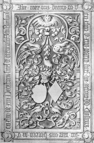 172 van Utrecht ontdekte 1) waarin hij Ao. 1466 staat vermeld. Maar het nieuwe Künstlerlexicon van Thieme-Becker noemt onzen beeldhouwer, en weet, op gezag van duitsche arche- ologen, van hem te vertellen, dat in den Dom te Bremen eertijds een grafsteen lag, waaruit bleek, dat P. D. wellicht van hollandsche (?) afkomst was! 2) - Zijn atelier blijkt wel in Friesland geweest te zijn, misschien weer in of bij Fra- neker. Wij noteerden: I. Deinum. Zerk voor Hessel van Feitsma 11.4. † 1557 en Luts van Mellema † 25.10. 1580. Bovenaan gemerkt P 1561 D. Origineel tegen den muur der kerk. Teekening in het Friesch Museum 327_7. Grafschr. Men.deel G86, p. 56/7 ill. t/o p. 64. II. Boxum. Zerk voor Worp van Juckama † 9.2. 1560 en Anna v. Mockema † 5.12. 1585. Bovenaan: P 1561 D. Origineel onzichtbaar. Teekening in het Fr. Mus. 326_8 III. Hallum. Zerk voor Gabbe van Scheltema † 1558 en Tets Origineel onzichtbaar. Afbeelding in Fr. Oudh. vol- gens teekening in 't Fr. Mus. 214_12a Nog één aldaar? Wytzo Oetsma (Juckema) † 1565 niet gsigneerd IV. Leiden (Pieterskerk). Zerk voor Claes Alewyn † __ en Anna v. d. Hooghe † 1558. Bovenaan [15 Pieter] Dircks 63. 15 Pieter en het sterfjaar van Claes Alewyn is niet meer te lezen. De stijl laat geen twijfel aan een friesch atelier over; doch zijn aanwezigheid in Leiden kunnen wij niet verklaren; is een van beide echtge- nooten van friesche herkomst of met friesche familiën verbonden? Een slechte teekening van dezen steen, zonder ver- melding der signatuur, in R. J. F. C. Kneppelhout: ----- 1) Bull. Ned. Oudhk. Bond I, blz. 214. 2) E. W. Moes, die voor de vermelding van Pieter en Jellis Claes in dit standdaardwerk zorgde (zie onder), kon die duitsche archeologen "des Besseren belehrt" en een stukje grond voor Nederland in de kunstenaarswereld veroverd hebben. | aantt. bij 172 Jorwerd. Zerk voor Hocko Fons 1558 (Voorl. lijst, Kunstreisb.) Leeuwarden. Memoriesteen kanselarij 1571 (45 gld) Wanswerd. Zerk voor Sipt Ghoslingha, † 7.6.1561, en Paesck (Bauck?) Zyaerda, † 7.6.1561(!); schikgodinnen, all.wapen; boven gemerkt: P D; onder: 1562; Friesch Dagblad 1.7.'82, 19 Harlingen. Zerk voor Aefke Sibrandtsdr., † 6.9.1562, huisvr. van Anne Claesz.; boven gemerkt: P D Mon. Ferw.deel p. 154, ill. p. 187 | ||