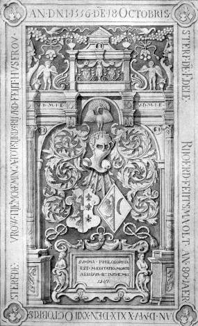 Leeuwarden. Jac.kerk. Zerk voor Ritske van Eysinga, † 1573, herbegraven 1592, x Mary van Tjaerda † 1601; in onderrand gemerkt: D.1593.L; foto