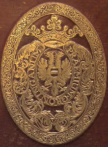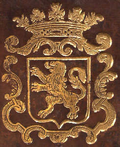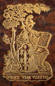 11 (cat. 2). HAARLEM, met de spreuk: Vicit vim virtus. Johannes Voet, Commentarius ad Pandectas. Hagae-Comitum 1704. - 2528 R b fol. Opmerkelijk is dat de rugtitel luidt: C.V. Bynkershoek, Opera.