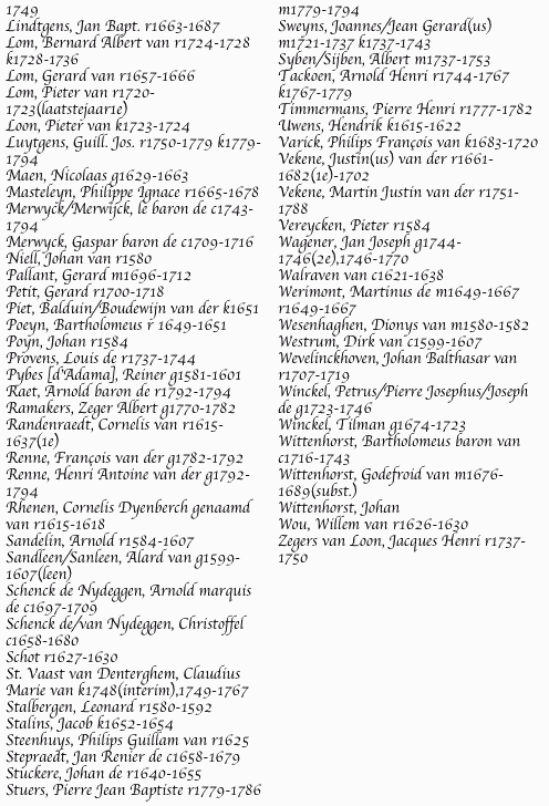 Willem van der Lindt of Lindanus, 1563-1588 Hendrik van Cuyck of Cuyckius, 1596-1609 Jacobus van den Borgh of a Gastro, 1611-1639 Andreas Creusen, 1651-1657 Eugenius Albertus d'Allamont, 1659-1666 Lancellot de Gottignies, 1672-1673 Reginaldus Cools, 1677-1700 Angelus graaf d'Ongnies en d'Estrées, 1701-1722 Franciscus Ludovicus Sanguessa, 1722-1741 Joseph Anselmus Franciscus van Werbrouck, 1742-1746 Joannes Antonius de Robiano, 1746-1769 Henricus Joannes Kerens, 1770-1775 Philippus Damianus van Hoensbroeck, 1775-1793 Johannes Baptista baron van Velde de Melroy, 1794-1801