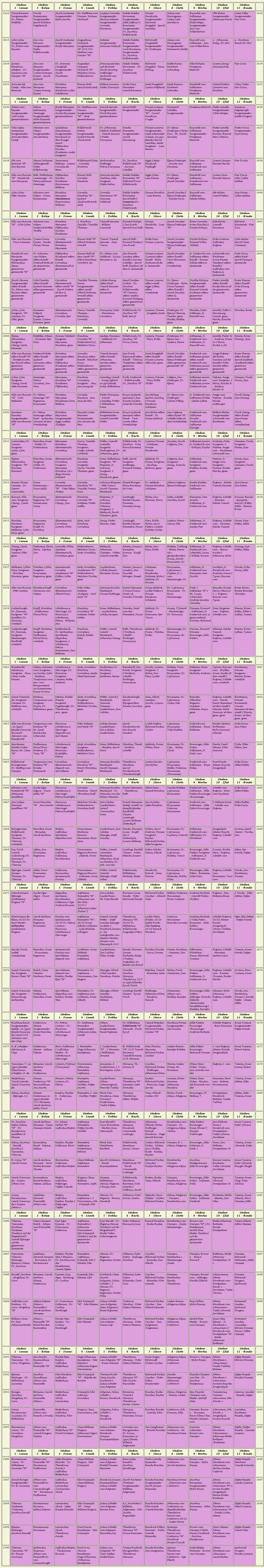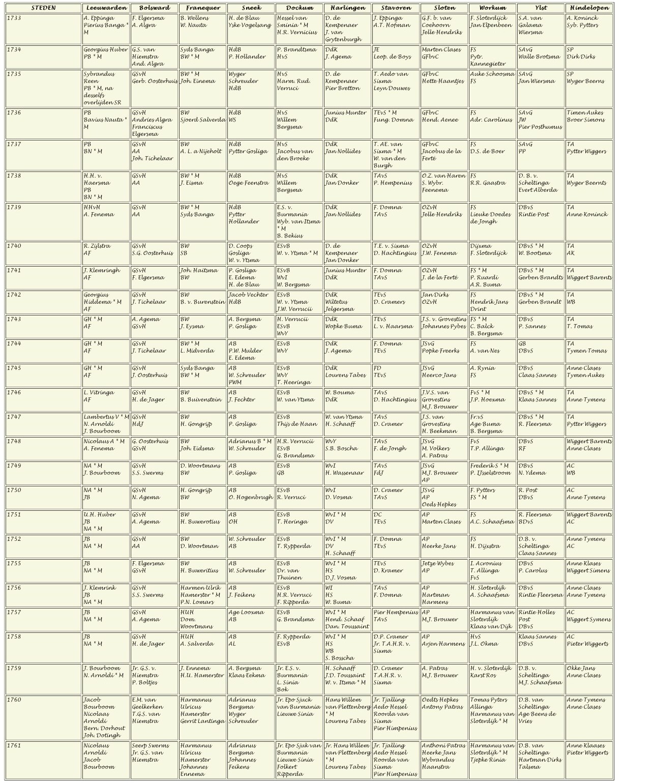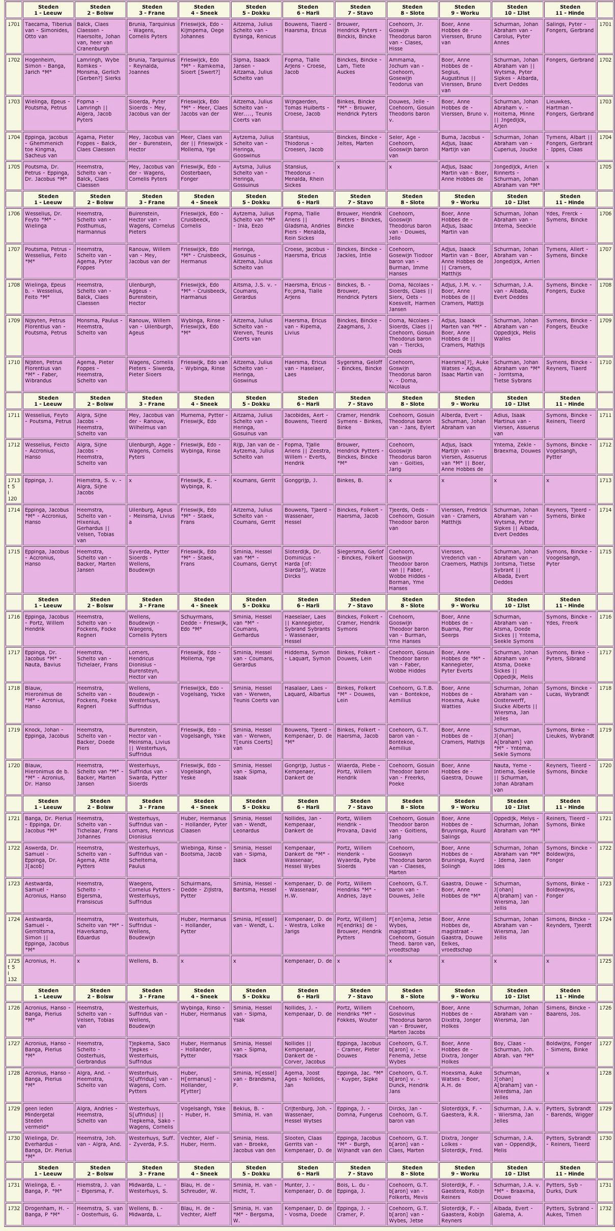 N.B. De spelling is in de chronologische naamlijst niet genormaliseerd; varianten zijn aangegeven na /. Bij verschillen tussen de bronnen is de correcte naam weergegeven achter de doorgehaalde foutieve. Vergelijk bij twijfel aan de spelling van een naam de voorgaande en volgende jaren. In het alfabetisch register van namen is de gebruikelijkste spelling vooraan geplaatst; genormaliseerde spellingen zijn voorzien van een *. Vergelijk het alfabetisch register altijd met de chronologische naamlijst. Meld aanvullingen en verbeteringen.